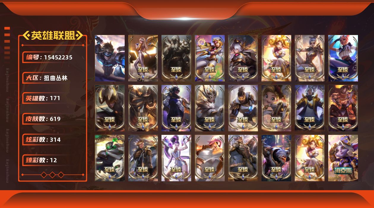 【283147】[15452235]t30266【扭曲丛林】619皮肤 314炫彩 12臻彩 45神话/80限定/57传说/171英雄 账号等级:1020 单双排段位:铂金 【重要头像】爱意绵绵 爱情之歌 泳池派对凯特琳 泳池派对佐伊 KDA萨勒芬妮 魄罗宇航员 沐浴震惊 此志无双羽饰骑士 至臻福牛守护者菲奥娜 至臻KDA卡莎 至臻奥术师佐伊 至臻魔女婕拉 【重要皮肤】机神玄武盖伦至臻 魔女婕拉