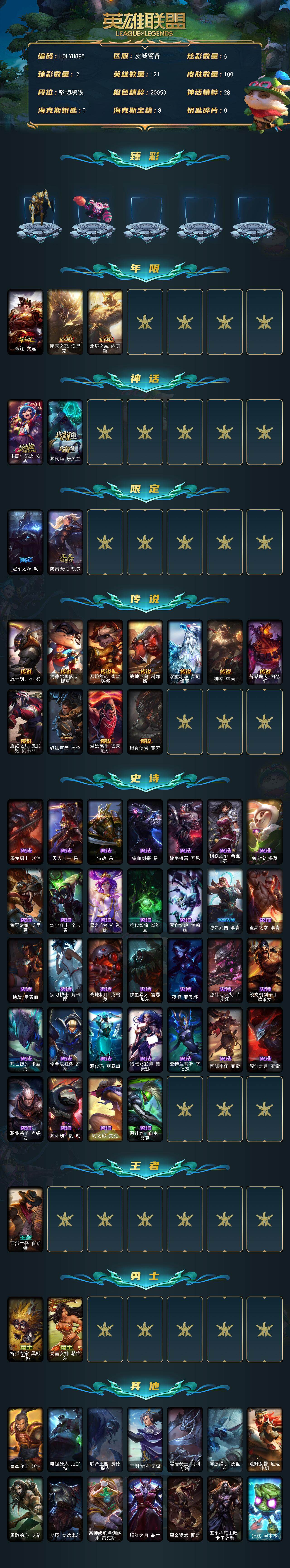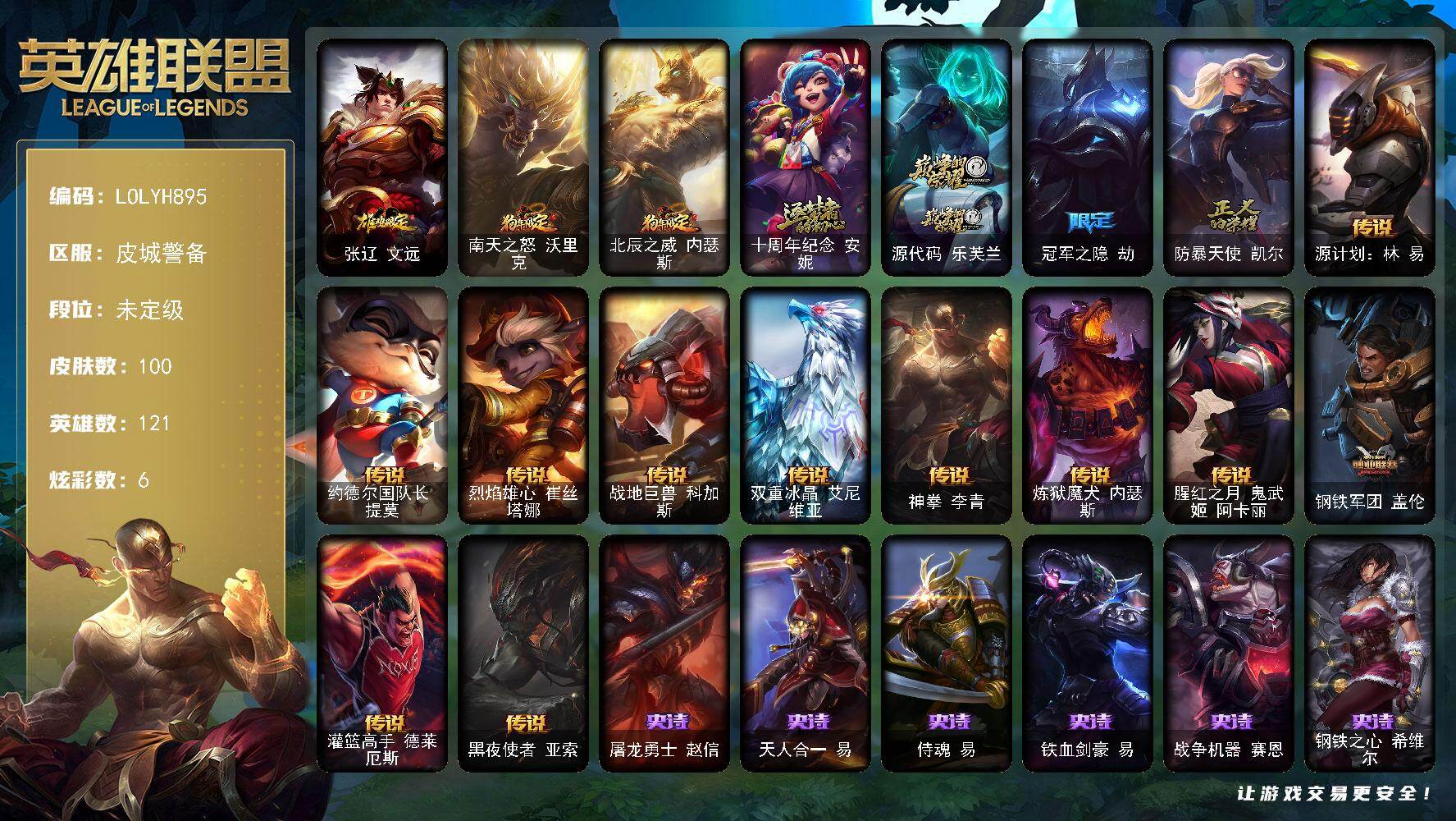 【283227】【LOLYH895】121英雄/100皮肤/2神话/5限定/2臻彩/6炫彩/11传说/32史诗/未定级账号等级:106/冠军之隐劫凯旋圣装/可爱可爱粉红红布里茨/张辽文远/南天之怒沃里克/北辰之威内瑟斯/十周年纪念安妮/源代码乐芙兰/冠军之隐劫/防暴天使凯尔/源计划:林易/约德尔国队长提莫/烈焰雄心崔丝塔娜/战地巨兽科加斯/双重冰晶艾尼维亚/神拳李青/炼狱魔犬内瑟斯/腥红之月鬼舞