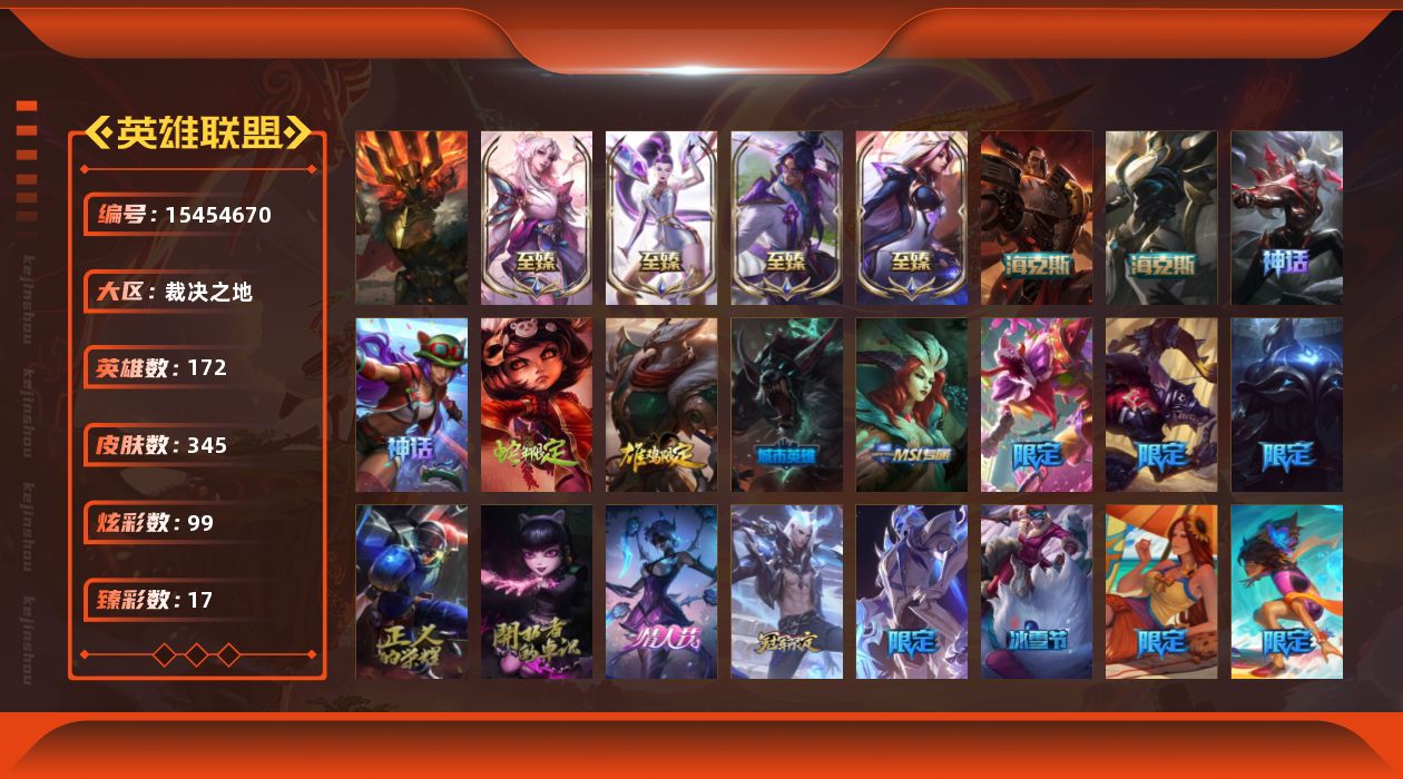 【283699】[15454670]t33979【裁决之地】萨恩乌祖尔莫德凯撒 345皮肤 99炫彩 17臻彩 10神话/42限定/35传说/172英雄 账号等级:495【重要头像】心型钥匙 银河魔装机神安妮 基斯 星守金克丝炫彩 【重要皮肤】萨恩乌祖尔莫德凯撒 灵魂莲华拉克丝至臻 绝息圣堂厄运小姐至臻 灵魂莲华易至臻 KDA二代卡莎至臻 殿堂传奇薇恩 殿堂传奇乐芙兰 恐惧