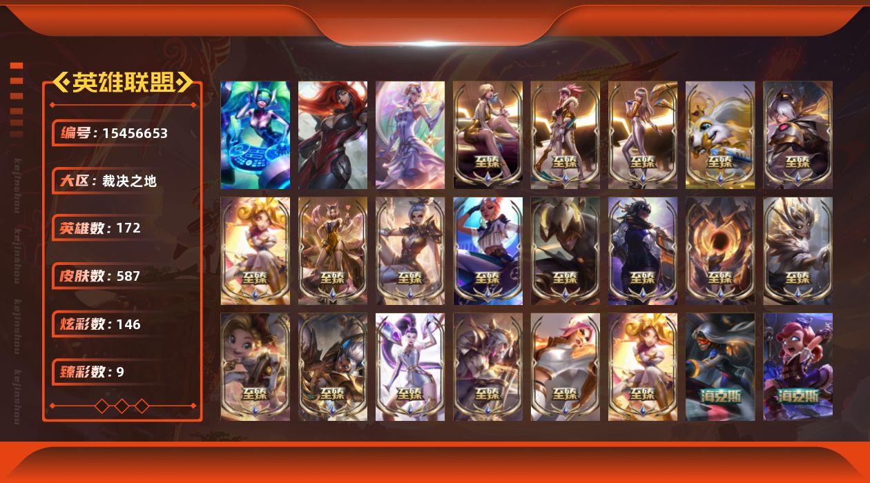 【284332】[15456653]t33949【裁决之地】587皮肤 146炫彩 9臻彩 28神话/115限定/57传说/172英雄 账号等级:513【重要头像】至爱的鹿 爱意绵绵 春晖神女拉克丝 小希 玉剑传说苍鸾炫彩 我麦是开的么 泳池派对凯特琳 泳池派对佐伊 万圣节卡特琳娜 KDA萨勒芬妮 小库 小崎 小斗 小多 糖果大战伊芙琳炫彩 小望与小牙 幼犬内瑟斯