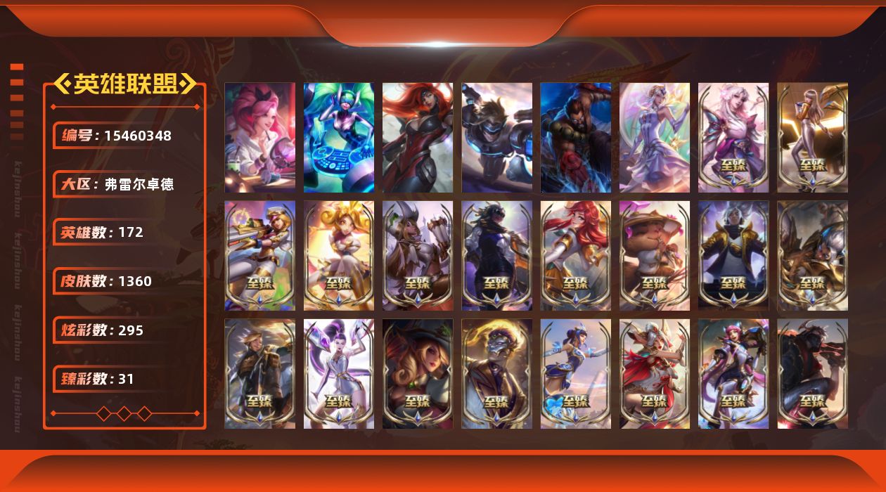 【285091】[15460348]t33982【弗雷尔卓德】白龙瞎 1360皮肤 295炫彩 31臻彩 32神话/265限定/118传说/172英雄 账号等级:450 云顶神话:1【重要头像】星守阿狸 爱情之歌 觅心之翼奎因 雪花 萨勒芬妮超级巨星 萨勒芬妮独立音乐人 春晖神女拉克丝 击拳 救生圈 小茹 幼犬内瑟斯 幼犬沃里克 沐浴震惊 福运魄罗 星界起源 至臻青