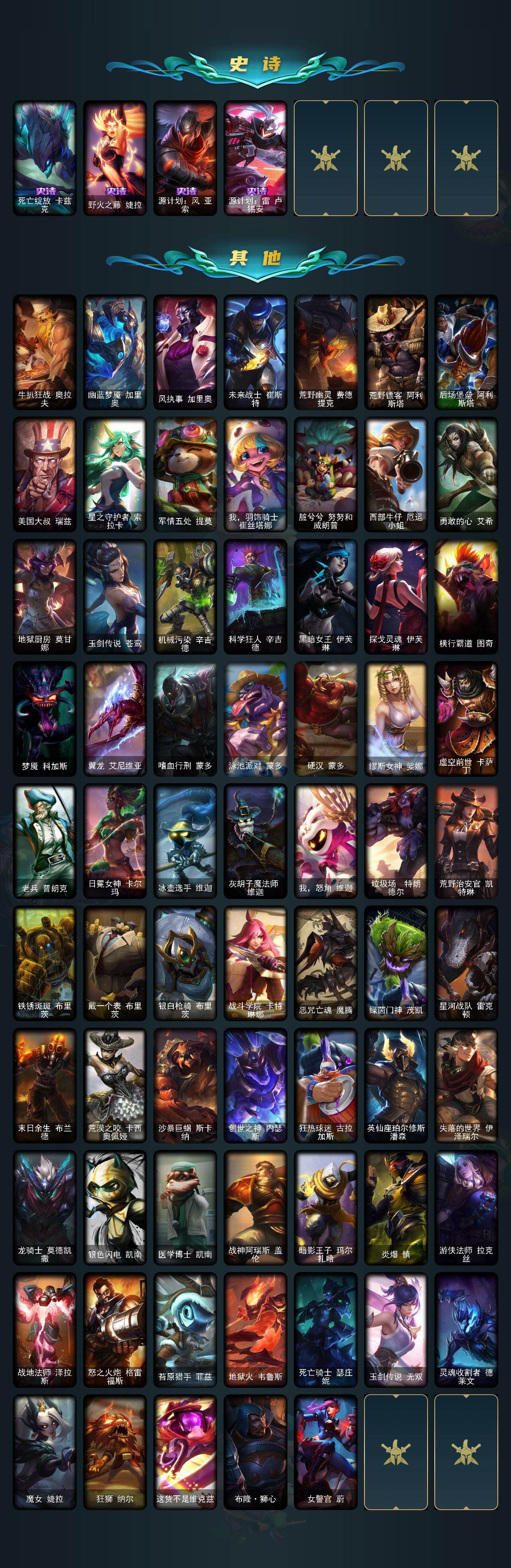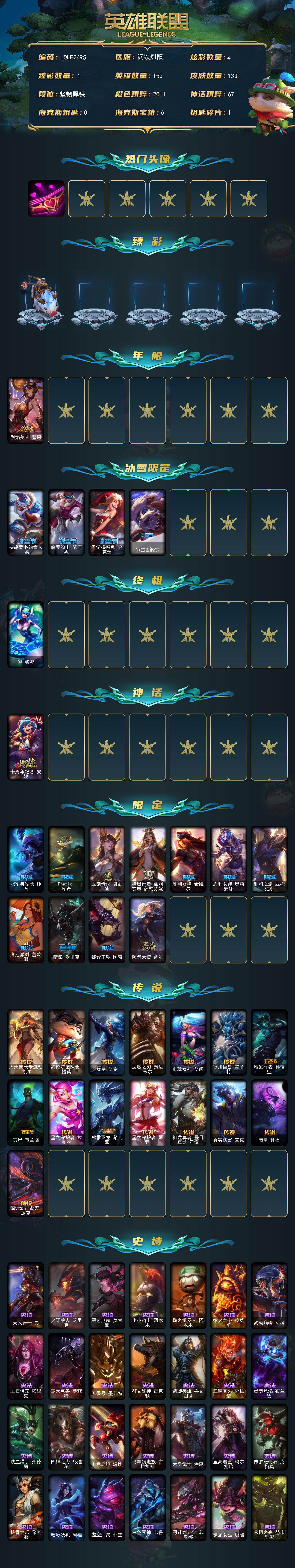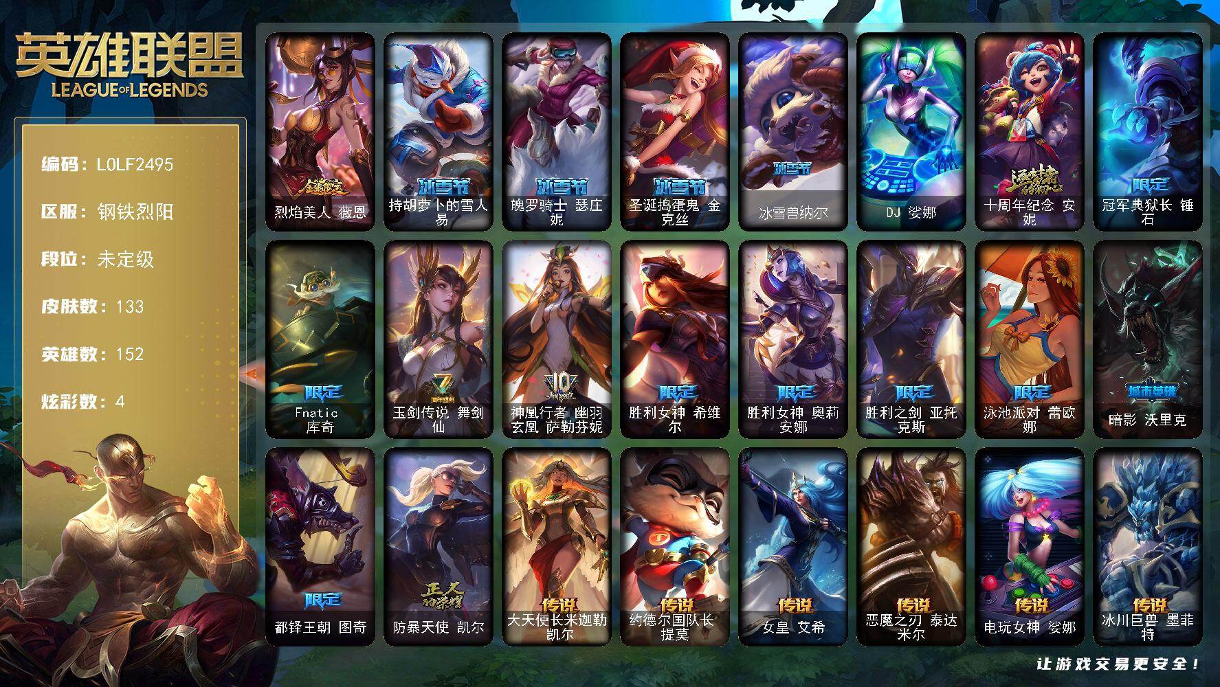 【285154】【LOLF2495】152英雄/133皮肤/1终极/1神话/16限定/1臻彩/4炫彩/15传说/32史诗/未定级/爱情之歌/无畏骑士瑟庄妮赤子初心/烈焰美人薇恩/持胡萝卜的雪人易/魄罗骑士瑟庄妮/圣诞捣蛋鬼金克丝/冰雪兽纳尔/DJ娑娜/十周年纪念安妮/冠军典狱长锤石/Fnatic库奇/玉剑传说舞剑仙/神凰行者幽羽玄凰萨勒芬妮/胜利女神希维尔/胜利女神奥莉安娜/胜利之剑亚托克斯/泳