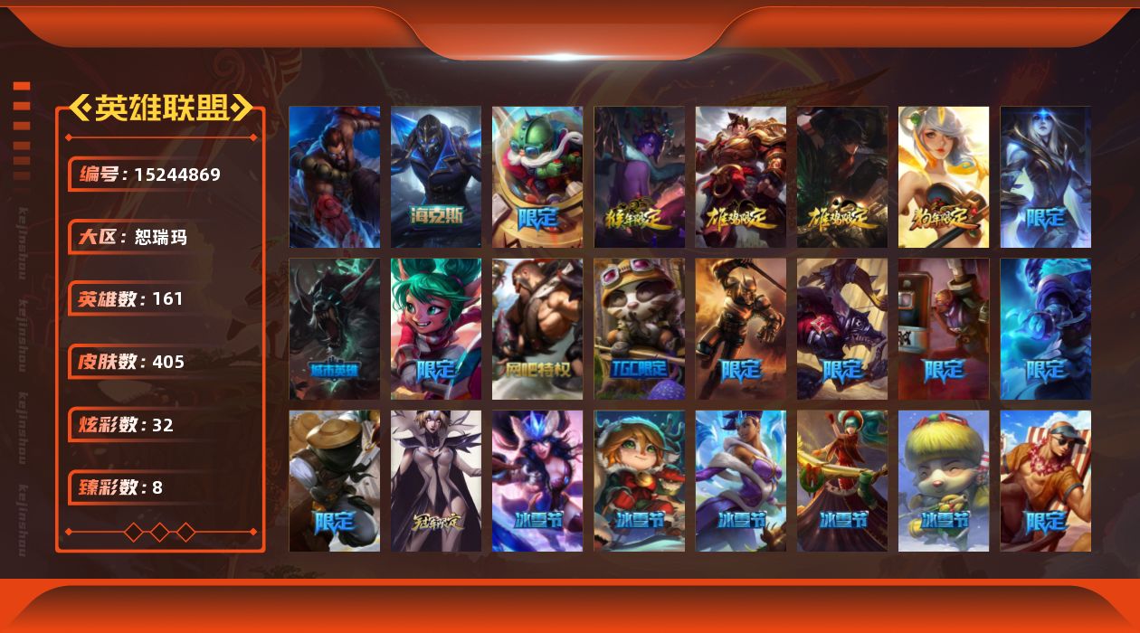 【287723】[15244869]t33550【恕瑞玛】405皮肤 32炫彩 8臻彩 3神话/54限定/27传说/161英雄 账号等级:272【重要头像】沐浴震惊 【重要皮肤】胜利之王泰达米尔 胜利巨口克格莫 创星之灵璐璐 养蜂人辛吉德 勇敢的心德莱厄斯 银龙裁决泰隆 天龙之子斯莫德 古琴余韵娑娜 春晖神女拉克丝 紫金罗刹莫甘娜 虎痴之拳蔚 张辽文远 胜利女神瑟庄妮