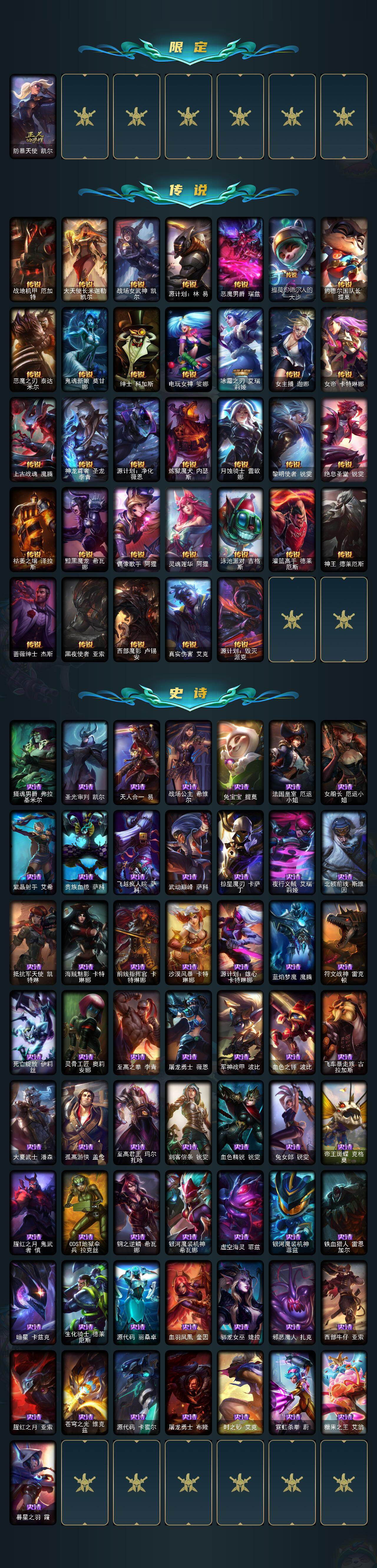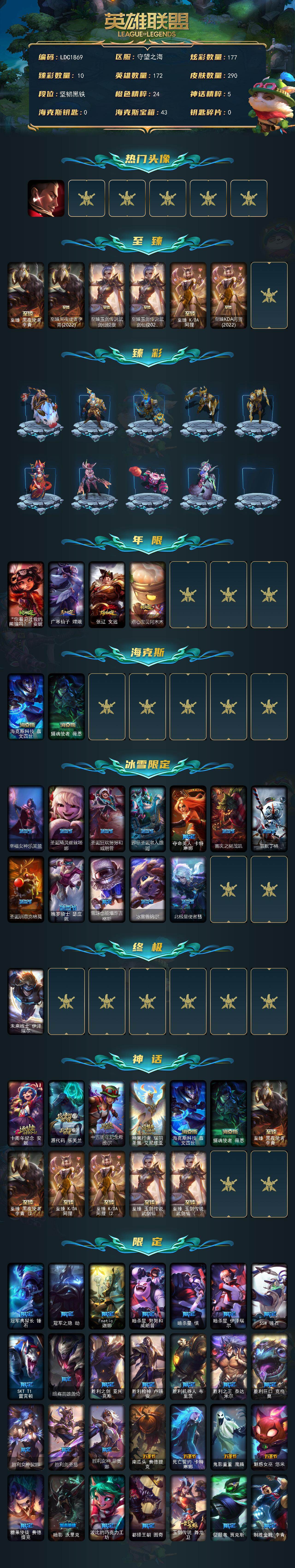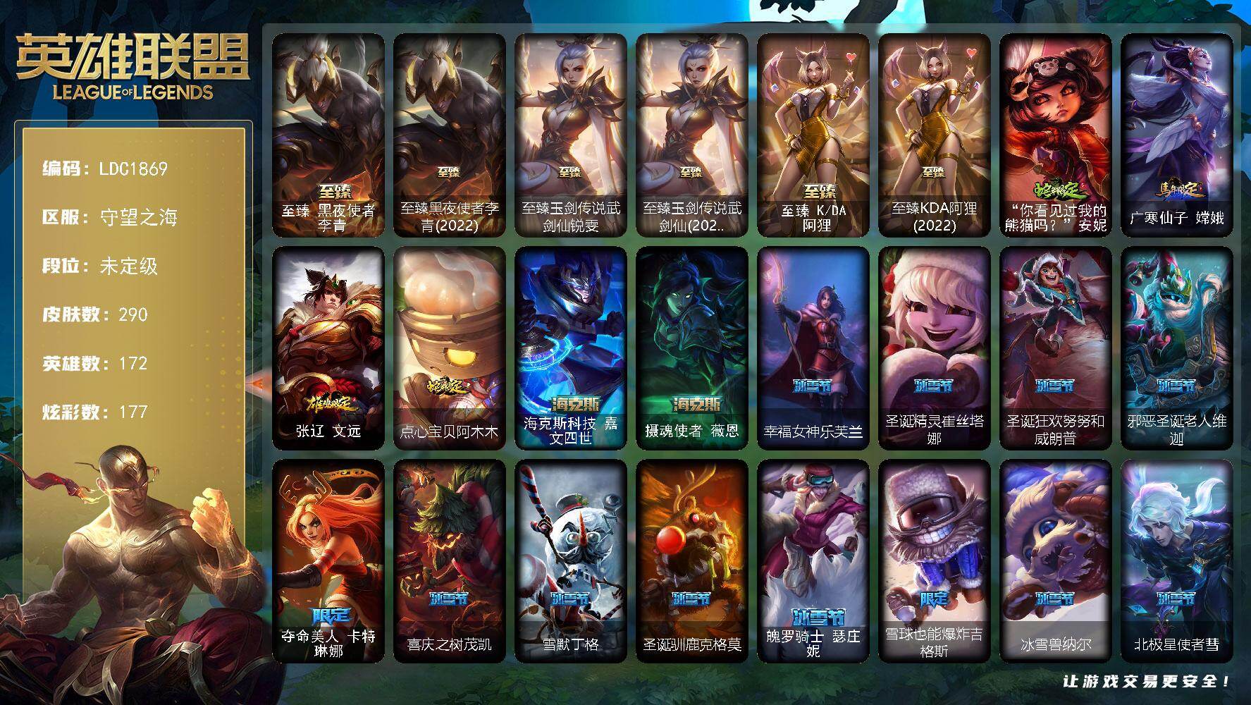 【287966】【LDC1869】172英雄/290皮肤/1终极/12神话/45限定/10臻彩/177炫彩/33传说/57史诗/未定级/觅心游侠卢锡安/至臻黑夜使者李青/至臻黑夜使者李青(2022)/至臻玉剑传说武剑仙/至臻玉剑传说武剑仙(2022)/至臻K/DA阿狸/至臻KDA阿狸(2022)/无畏骑士瑟庄妮赤子初心/冠军之志瑞兹凯旋圣装/冠军典狱长锤石凯旋圣装/冠军之血希瓦娜凯旋圣装/冠军之
