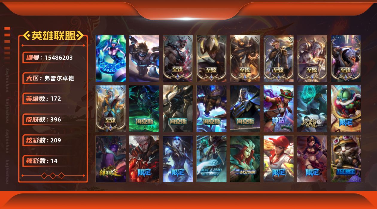 【289780】[15486203]t34064 皇冠账号【弗雷尔卓德】396皮肤 209炫彩 14臻彩 13神话/72限定/52传说/172英雄 账号等级:486【重要头像】爱情之歌 星守金克丝炫彩 披萨鸡 送披萨的小姐姐希维尔 西部魔影莎弥拉炫彩 【重要皮肤】机神玄武盖伦至臻 T1塞拉斯至臻 天龙之子伊泽瑞尔至臻 女帝黛安娜至臻 灵能特工伊泽瑞尔至臻 源计划阴劫至臻 黑