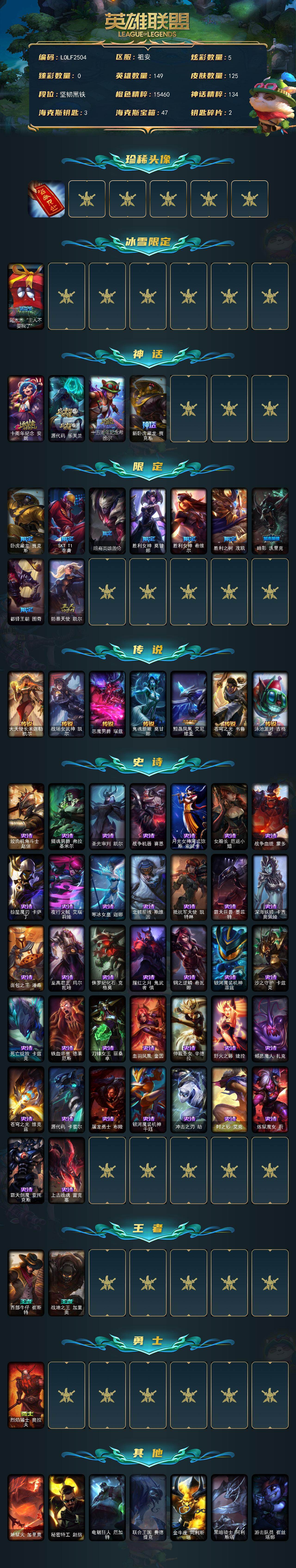 【289949】【LOLF2504】149英雄/125皮肤/4神话/10限定/5炫彩/7传说/37史诗/未定级/红包/阿木木:“主人不要我了”/十周年纪念安妮/源代码乐芙兰/十五周年纪念希维尔/新卧虎藏龙贾克斯/卧虎藏龙贾克斯/SKTT1李青/暗裔英雄盖伦/胜利女神莫甘娜/胜利女神希维尔/胜利之树茂凯/暗影妖狐阿狸/都铎王朝图奇/防暴天使凯尔/大天使长米迦勒凯尔/战场女武神凯尔/恶魔男爵瑞兹/鬼