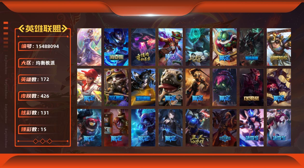 【290147】[15488094]t34020【均衡教派】 426皮肤 131炫彩 15臻彩 6神话/56限定/42传说/172英雄 账号等级:802【重要头像】卡特琳娜的匕首 星守金克丝炫彩 披萨鸡 送披萨的小姐姐希维尔 此志无双羽饰骑士 【重要皮肤】海克斯科技嘉文四世 暗星科加斯 胜利女神希维尔 舞会公主安妮 奥斯曼大帝泰达米尔 荣誉使者玛尔扎哈 电玩女神厄运小姐