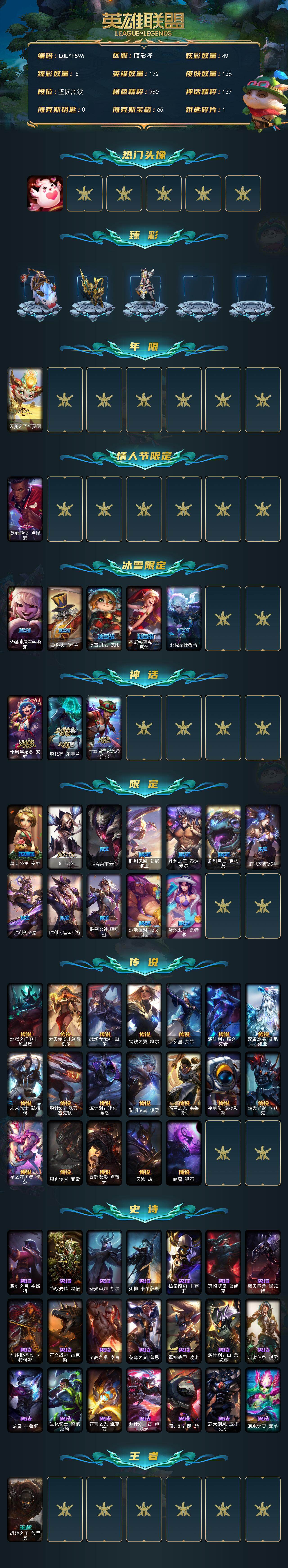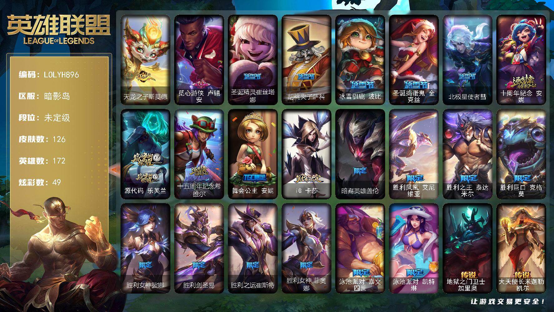 【290214】【LOLYH896】172英雄/126皮肤/3神话/19限定/5臻彩/49炫彩/19传说/21史诗/未定级账号等级:537/爱情鸽/无畏骑士瑟庄妮赤子初心/吕布奉先炫金战神/冠军之刃锐雯2016凯旋圣装/咖啡甜心金克丝核桃巴菲/幻灵战斗蝠薇恩梦幻强袭/天龙之子斯莫德/觅心游侠卢锡安/圣诞精灵崔丝塔娜/胡桃夹子萨科/冰雪驯鹿波比/圣诞捣蛋鬼金克丝/北极星使者彗/十周年纪念安妮/源代