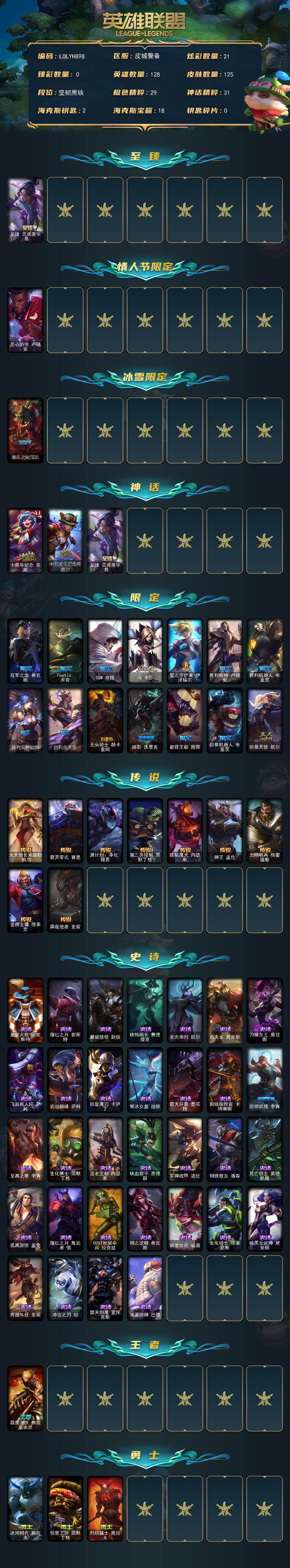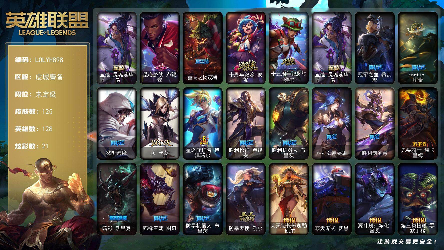 【290376】【LOLYH898】128英雄/125皮肤/3神话/16限定/21炫彩/9传说/32史诗/未定级账号等级:336/至臻灵魂莲华易/觅心游侠卢锡安/喜庆之树茂凯/十周年纪念安妮/十五周年纪念希维尔/冠军之血希瓦娜/Fnatic库奇/SSW泰隆/IG卡莎/星之守护者伊泽瑞尔/胜利枪神卢锡安/胜利机器人布里茨/胜利女神娑娜/胜利剑圣易/无头骑士赫卡里姆/暗影妖狐阿狸/都铎王朝图奇/防暴