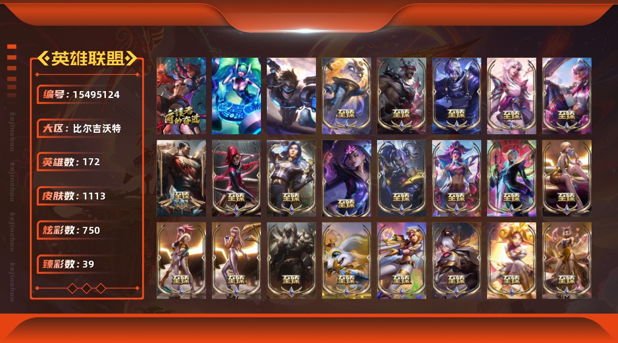 【291588】[15495124]t34059 皇冠账号【比尔吉沃特】原皮龙瞎 1113皮肤 750炫彩 39臻彩 99神话/149限定/104传说/172英雄 账号等级:973 云顶神话:3 单双排段位:黄金【重要头像】爱情之歌 银河魔装机神安妮 我麦是开的么 魔女伊芙琳炫彩 魔女伊芙琳 阿兰 KDA阿狸 KDA阿狸炫彩 KDA萨勒芬妮 幻灵战斗队长厄运小姐 幻灵战斗队长