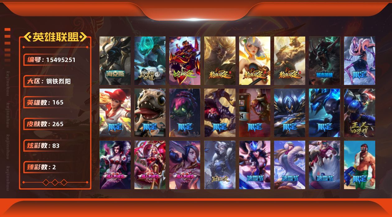 【291611】[15495251]t34061【钢铁烈阳】265皮肤 83炫彩 2臻彩 4神话/41限定/39传说/165英雄 账号等级:636【重要头像】幼犬沃里克 小智 披萨鸡 送披萨的小姐姐希维尔 【重要皮肤】零之枪骑赫卡里姆 荣誉使者玛尔扎哈 电玩勇者锐雯 星之守护者伊泽瑞尔 春晖神女拉克丝 北辰之威内瑟斯 南天之怒沃里克 神龙之翼库奇 胜利枪神格雷福斯 甜心
