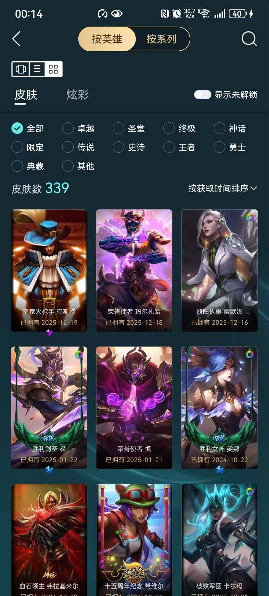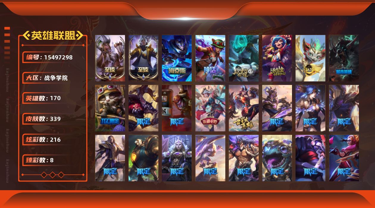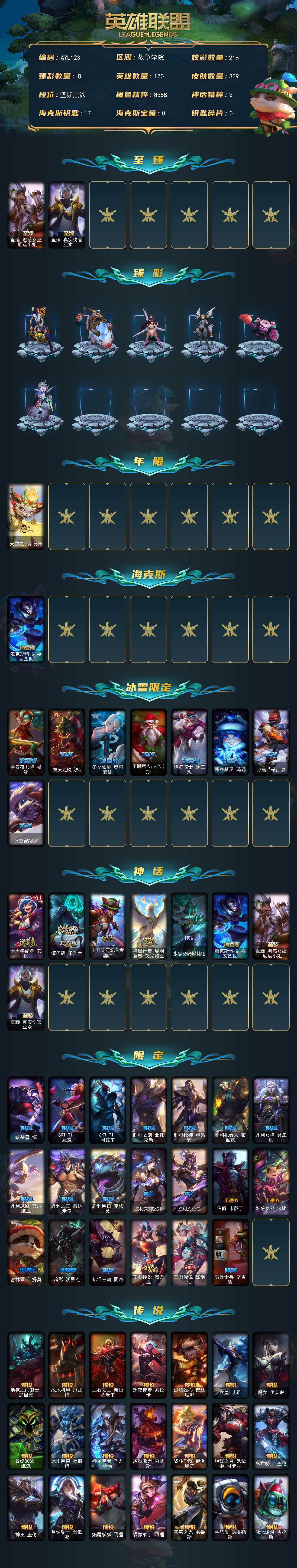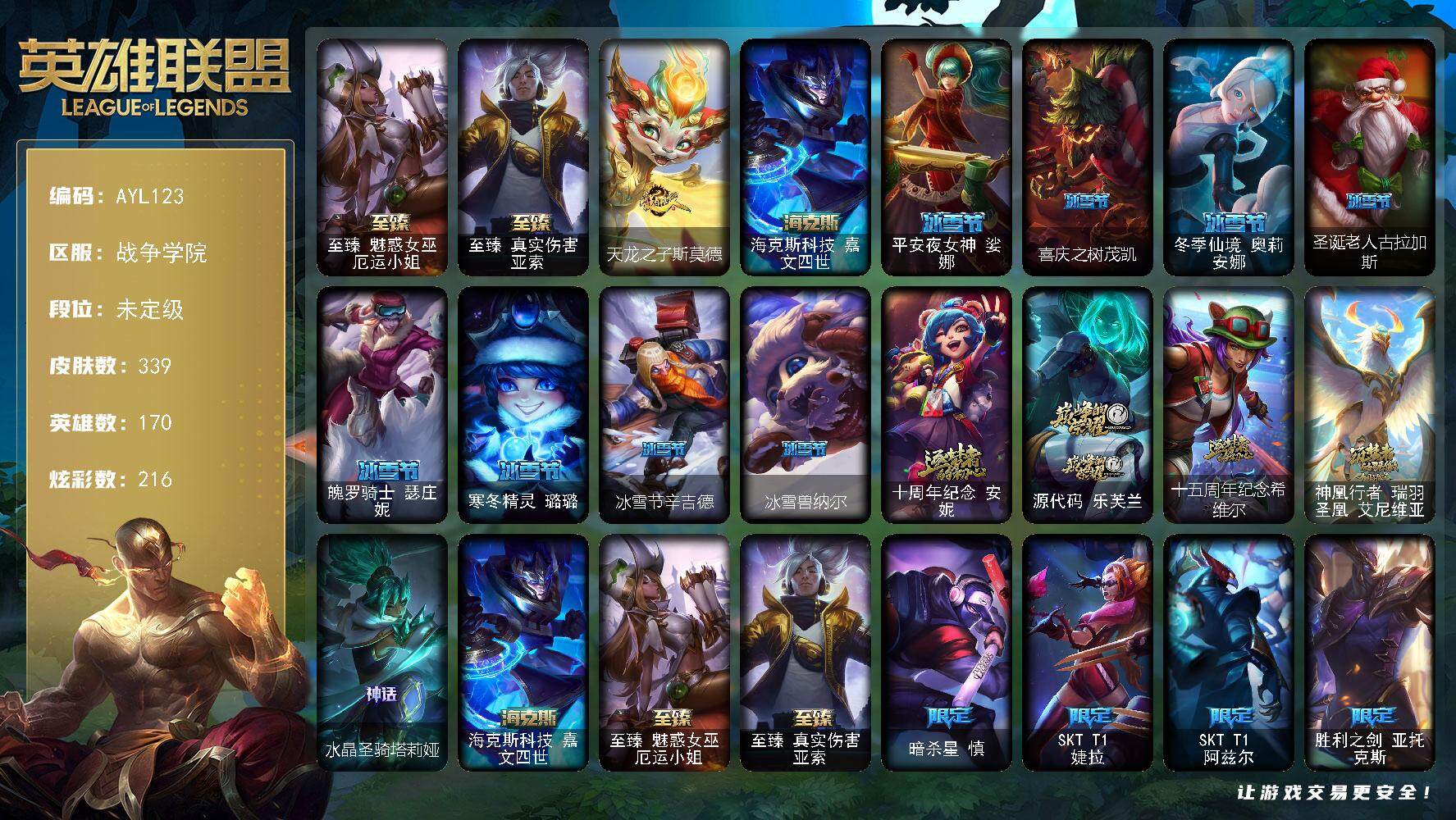 【291967】[15497298]未定级段位-170英雄-339皮肤-216炫彩-0终极-8神话-29限定-26传说-71史诗【至臻皮肤】:至臻魅惑女巫厄运小姐,至臻真实伤害亚索【臻彩皮肤】:神龙烈焰金克丝珍珠龙息,天龙之子卡莎飞龙乘云,无畏骑士瑟庄妮赤子初心,玉剑传说舞剑仙承影,弹幕天使卡莎炽天使公正,可爱可爱粉红红布里茨,魔女阿卡丽虚荣,净雪之月莫甘娜冬虹【年限皮肤】:天龙之子斯莫德【海克