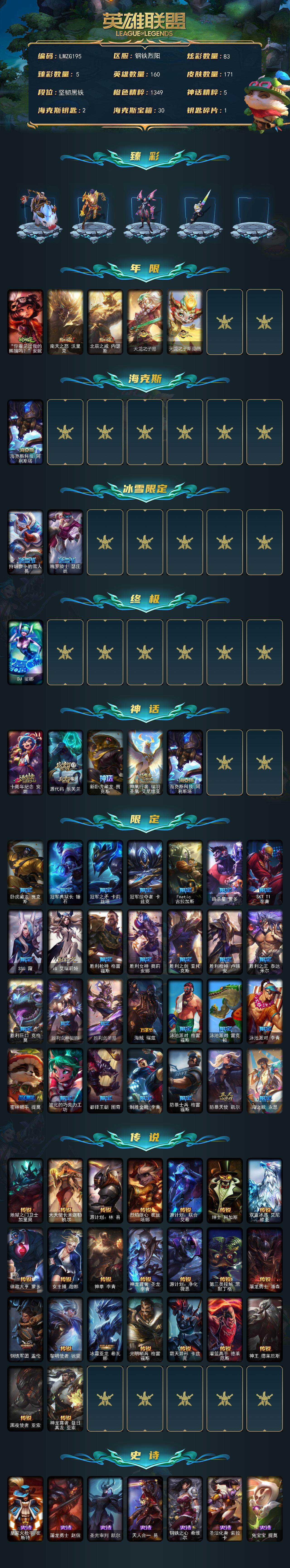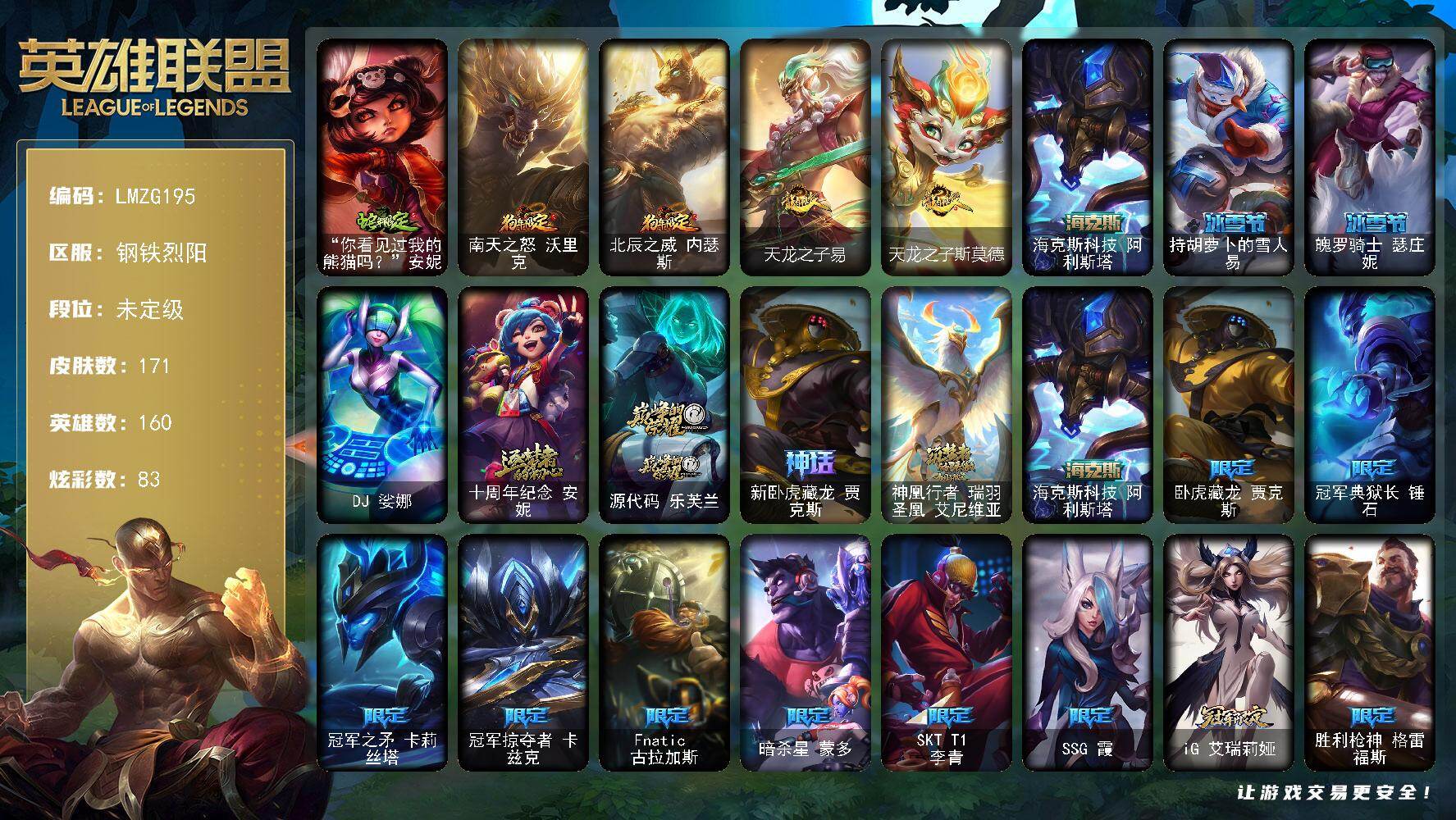 【292070】【LMZG195】160英雄/171皮肤/1终极/5神话/35限定/5臻彩/83炫彩/23传说/48史诗/未定级账号等级:501/无畏骑士瑟庄妮赤子初心/神龙尊者圣龙李青龙腾云起/弹幕天使卡莎炽天使勇敢/持七彩冰棍的雪人易/灌篮高手德莱厄斯金色神话/“你看见过我的熊猫吗?”安妮/南天之怒沃里克/北辰之威内瑟斯/天龙之子易/天龙之子斯莫德/海克斯科技阿利斯塔/持胡萝卜的雪人易/魄罗