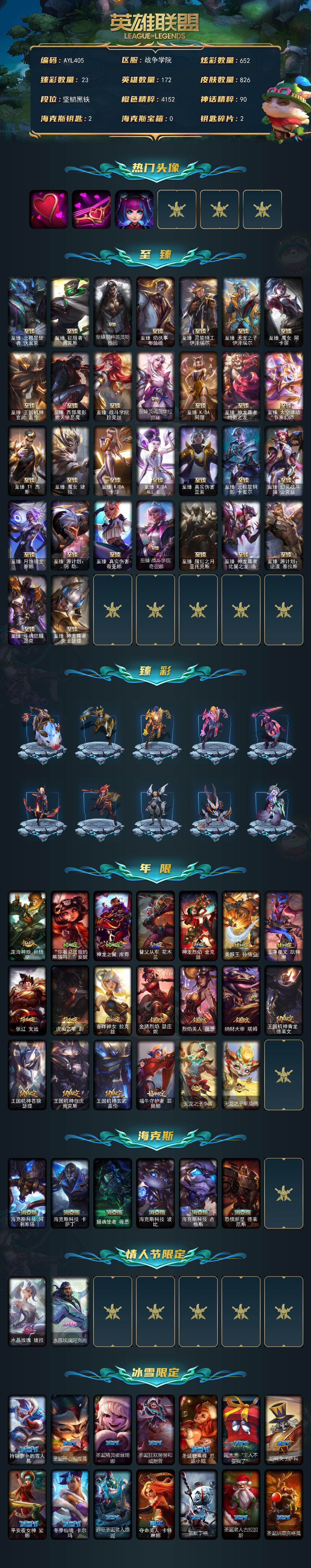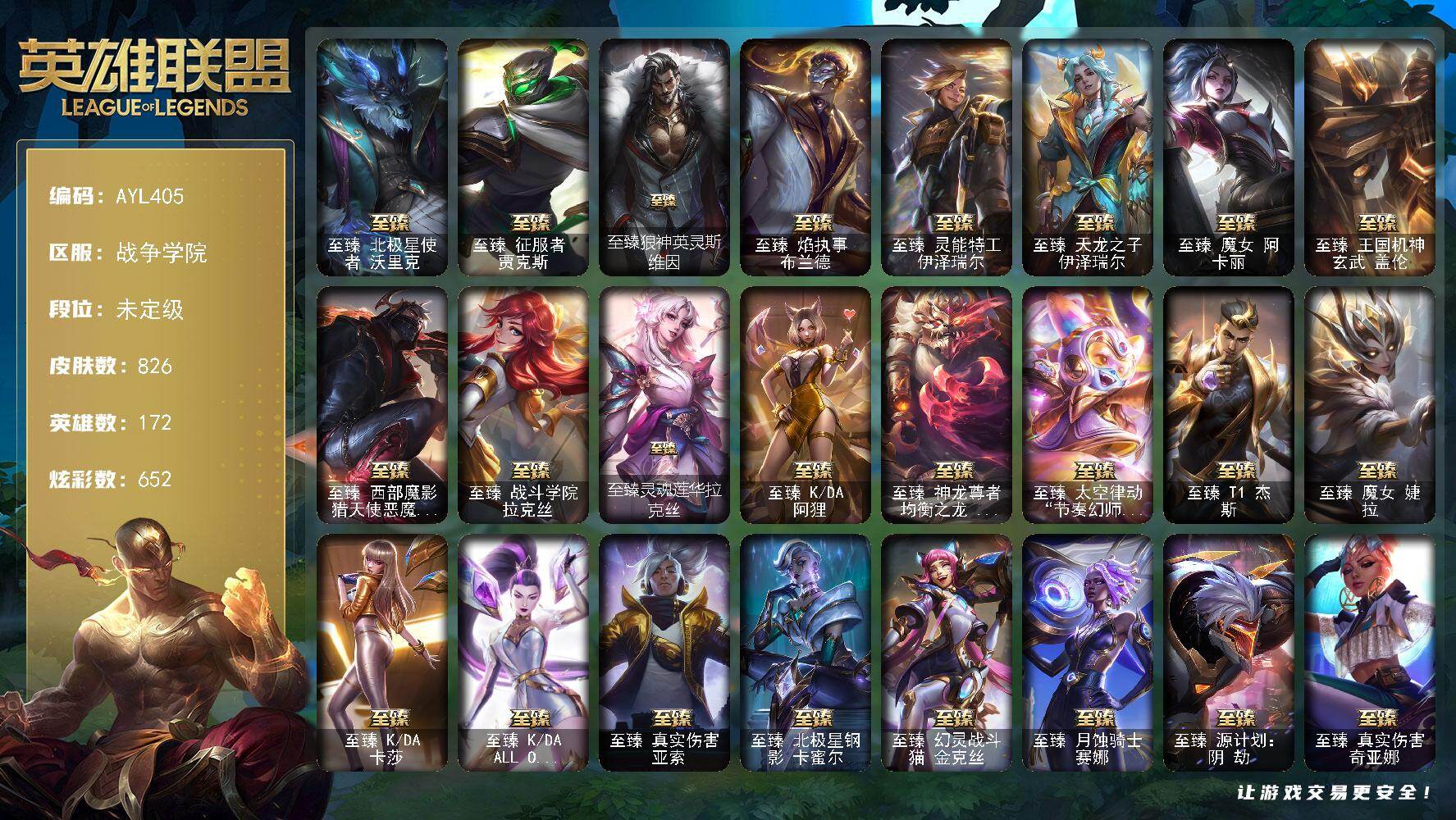 【292151】[15497941]【特价出售/店主推荐】未定级段位-172英雄-826皮肤-652炫彩-3终极-42神话-126限定-91传说-161史诗【热门头像】:爱意绵绵头像,爱情之歌头像,银河魔装机神安妮头像【至臻皮肤】:至臻北极星使者沃里克,至臻征服者贾克斯,至臻狼神英灵斯维因,至臻焰执事布兰德,至臻灵能特工伊泽瑞尔,至臻天龙之子伊泽瑞尔,至臻魔女阿卡丽,至臻王国机神玄武盖伦,至臻西