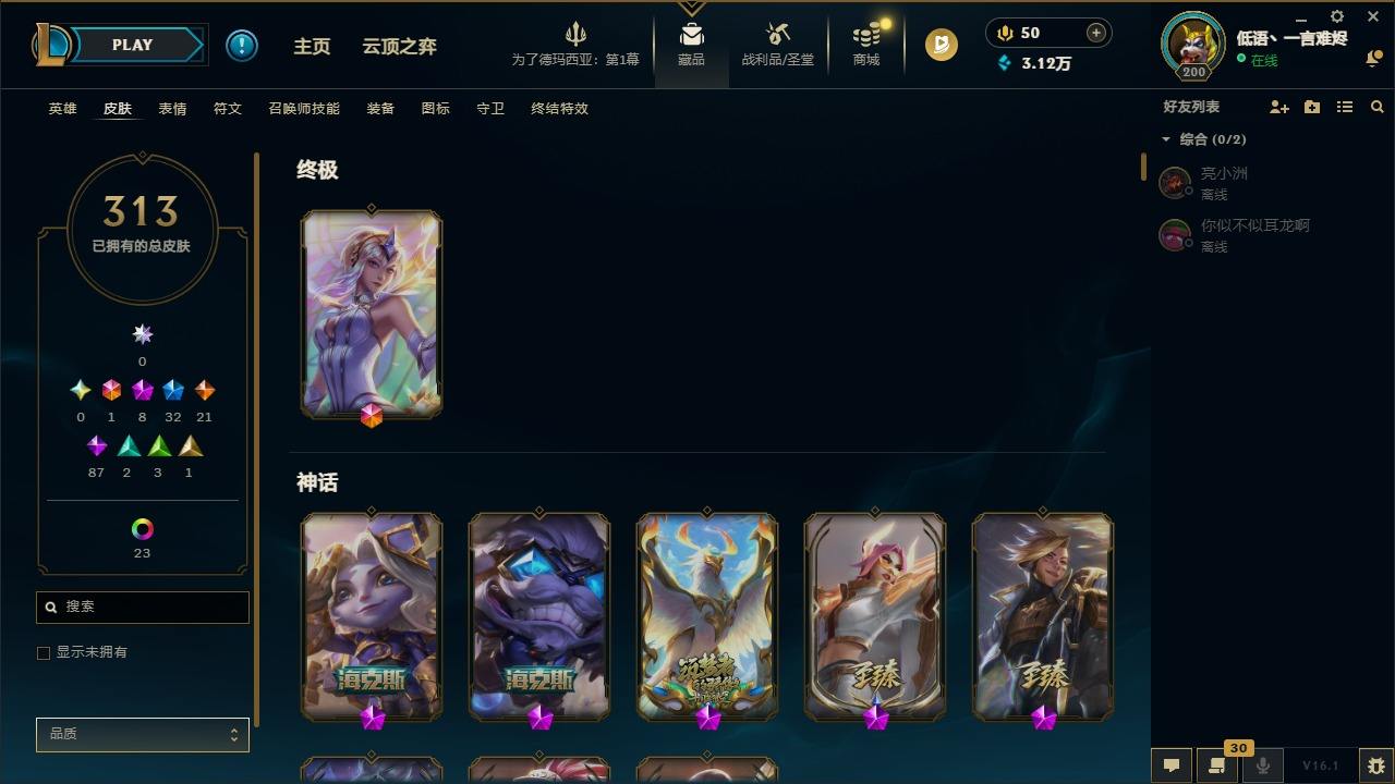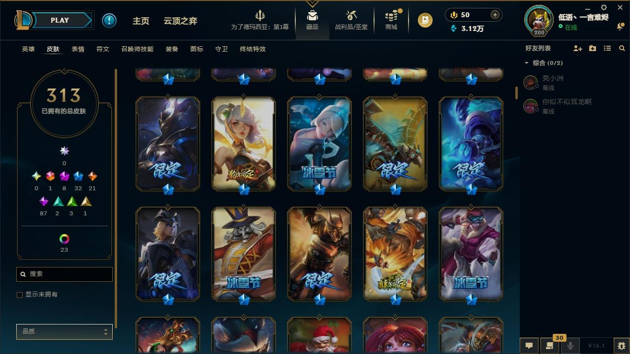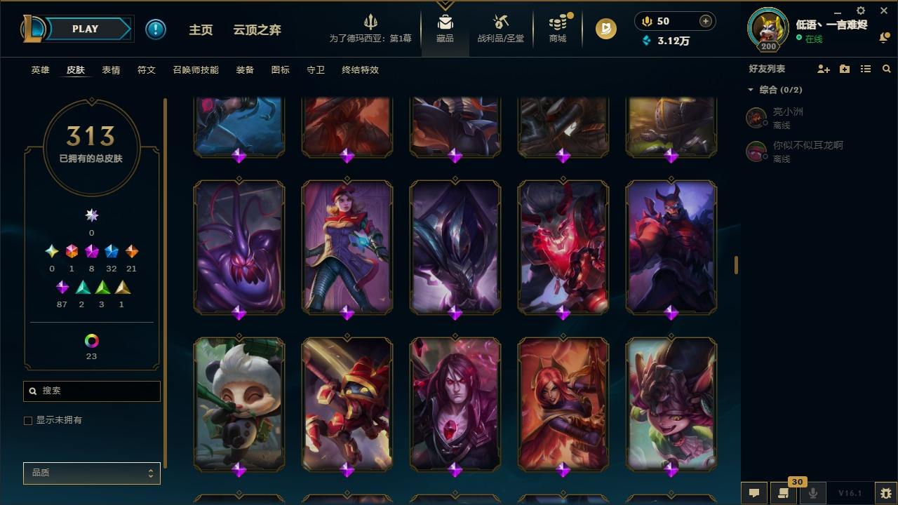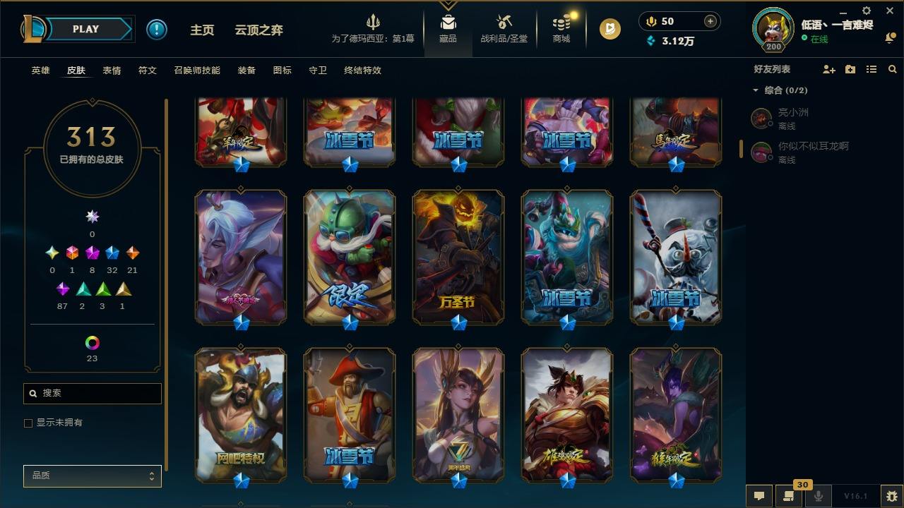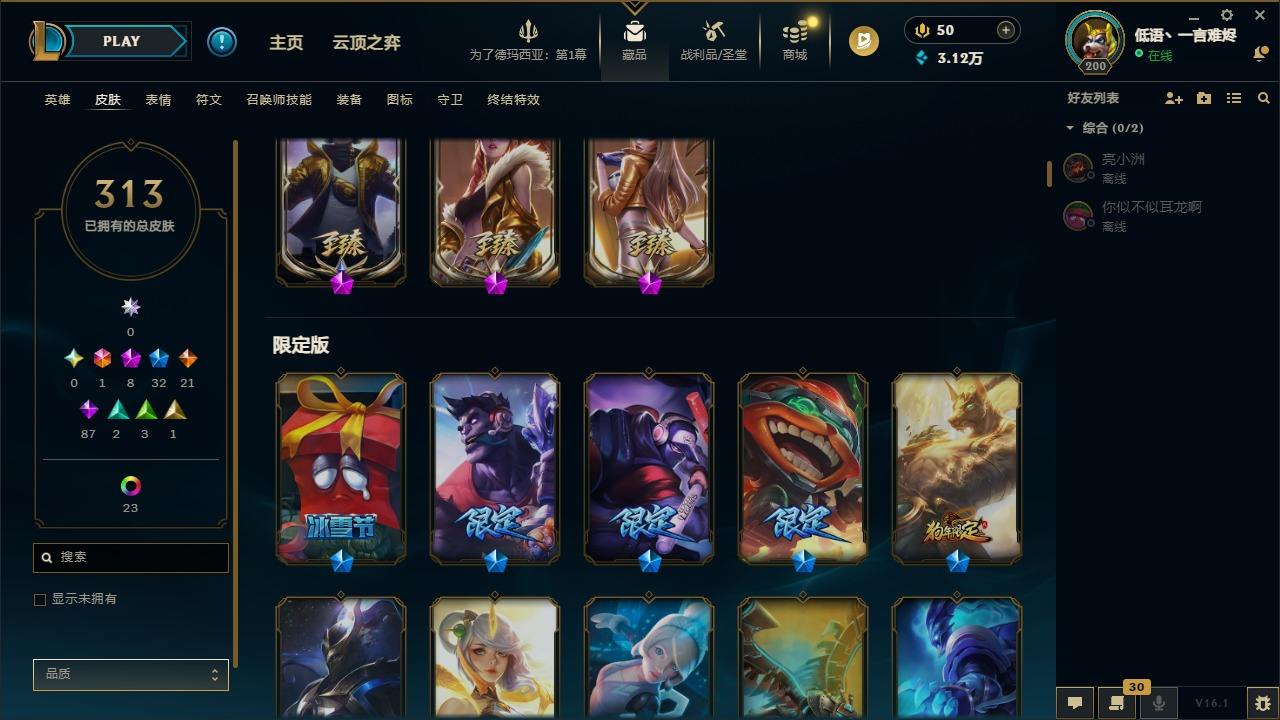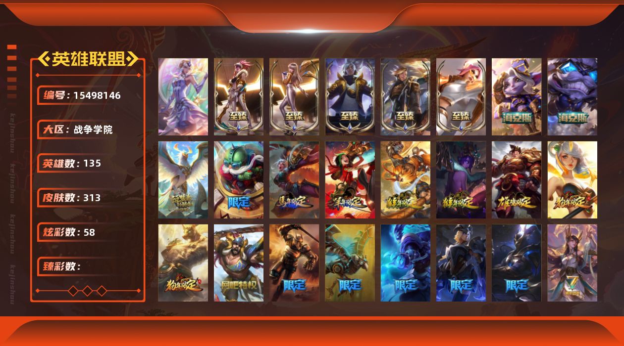 【292200】[15498146]1终极 8神话 32限定 21传说 87史诗 313皮肤 58炫彩 135英雄 可二次 可修改实名 【至臻】至臻 K/DA 阿卡丽,至臻 K/DA 卡莎,至臻 真实伤害 亚索,至臻 灵能特工 伊泽瑞尔,至臻 福牛守护者 菲奥娜【海克斯】海克斯 崔丝塔娜,海克斯 吉格斯【限定】穿星魔锋 赵信【情人节限定】甜心之翎 洛【冠军限定系列】S1FNC 卡尔萨斯,S2 暗