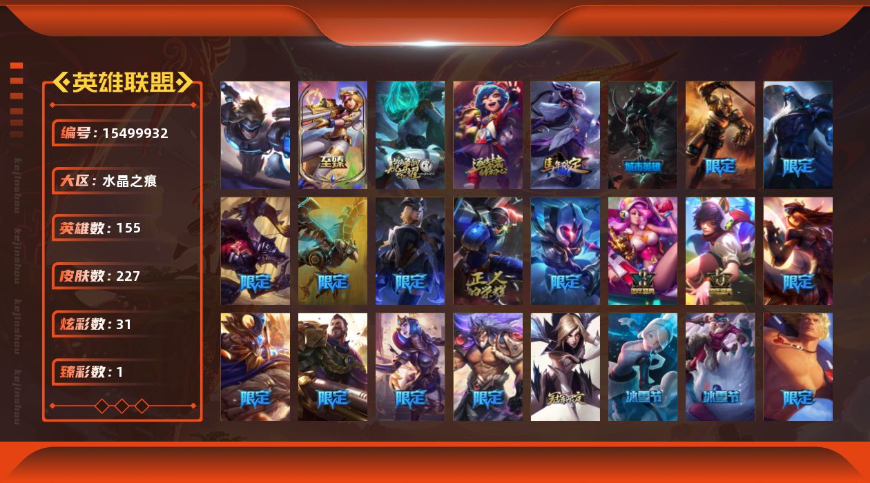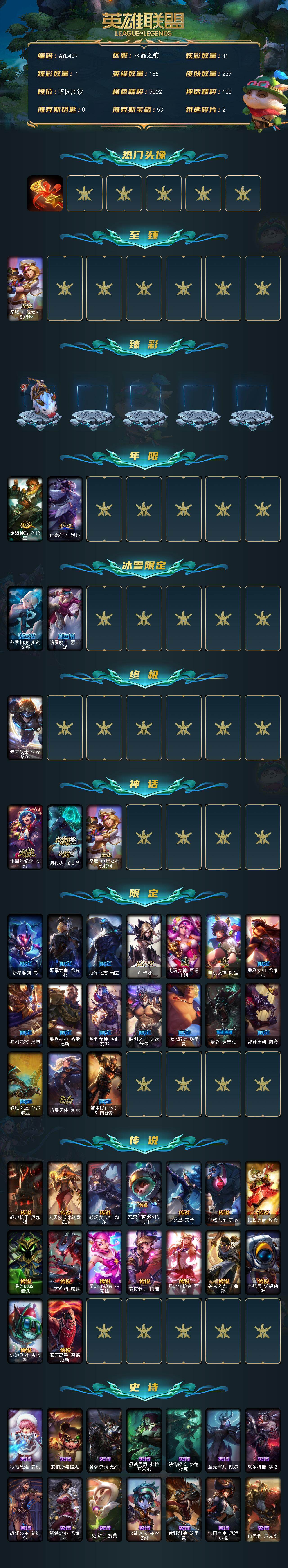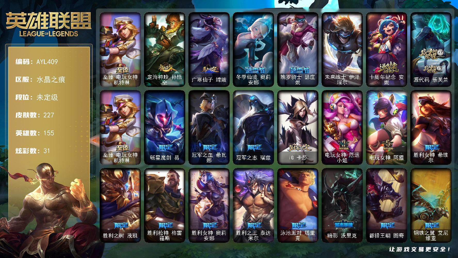 【292629】[15499932]【特价出售/店主推荐】未定级段位-155英雄-227皮肤-31炫彩-1终极-3神话-21限定-16传说-69史诗【热门头像】:卡特琳娜的匕首头像【至臻皮肤】:至臻电玩女神凯特琳【臻彩皮肤】:无畏骑士瑟庄妮赤子初心【年限皮肤】:定海神珍孙悟空,广寒仙子嫦娥【冰雪限定】:冬季仙境奥莉安娜,魄罗骑士瑟庄妮【终极皮肤】:未来战士伊泽瑞尔【神话皮肤】:十周年纪念安妮,源