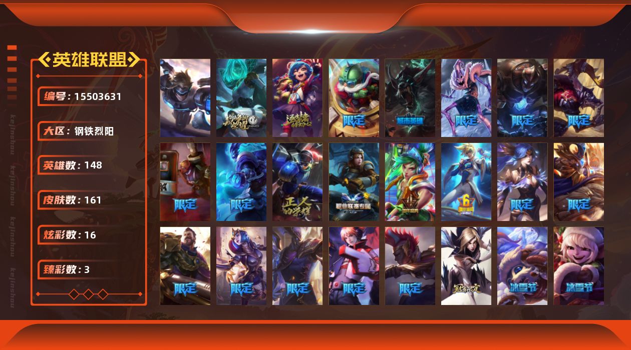 【293369】[15503631]可二次【店主推荐捡漏号!可直接换绑】黄金段位-148英雄-161皮肤-16炫彩-1终极-2神话-25限定-11传说-38史诗【臻彩皮肤】:冠军典狱长锤石凯旋圣装,弹幕天使卡莎炽天使勇敢,魔女阿卡丽虚荣【冰雪限定】:圣诞精灵崔丝塔娜,圣诞狂欢努努和威朗普,胡桃夹子萨科,圣诞玩偶波比,冰雪兽纳尔【终极皮肤】:未来战士伊泽瑞尔【神话皮肤】:十周年纪念安妮,源代码乐芙
