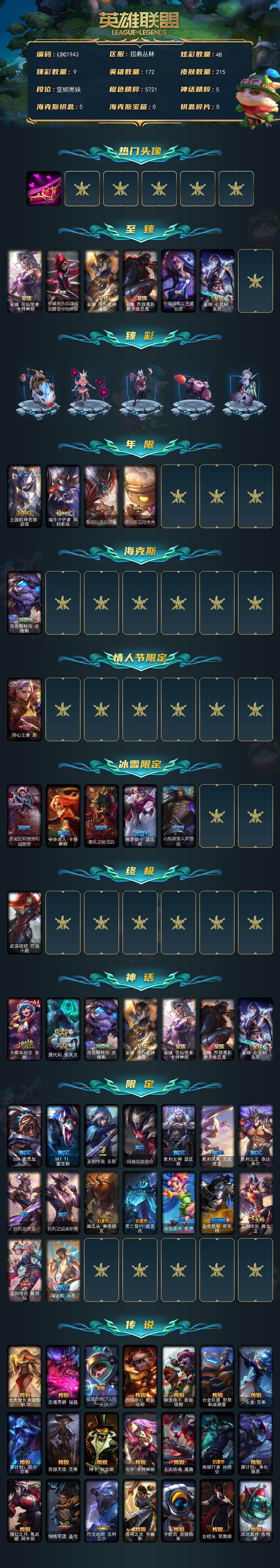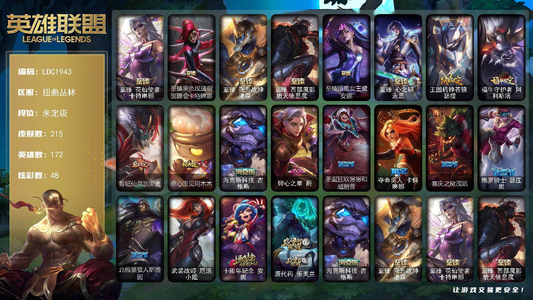 【293520】【LDC1943】172英雄/215皮肤/1终极/9神话/27限定/9臻彩/48炫彩/29传说/30史诗/未定级/爱情之歌/至臻花仙使者卡特琳娜/至臻黑色玫瑰假面舞会卡特琳娜/至臻飞升战神潘森/至臻西部魔影猎天使恶魔泰隆/至臻暗星女王黛安娜/至臻心之钢永恩/无畏骑士瑟庄妮赤子初心/星之守护者辛德拉未来之光/星之守护者卡莎热情之光/可爱可爱粉红红布里茨/魔女阿卡丽虚荣/魔女阿狸饕餮