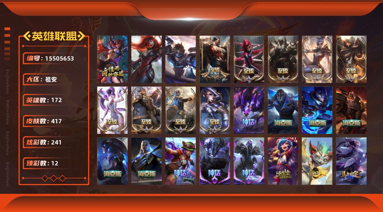【293708】[15505653]可二次【特价出售/店主推荐】未定级段位-172英雄-417皮肤-241炫彩-3终极-20神话-50限定-43传说-102史诗【热门头像】:爱情之歌头像【至臻皮肤】:至臻西部魔影伊芙琳,至臻黑色玫瑰假面舞会卡特琳娜,至臻王国机神玄武盖伦,至臻玉剑传说武剑仙锐雯,至臻凯旋将军德莱厄斯,至臻黑夜使者凯隐,至臻KDAALLOUT卡莎,至臻腥红之月亚托克斯,至臻源计划逆