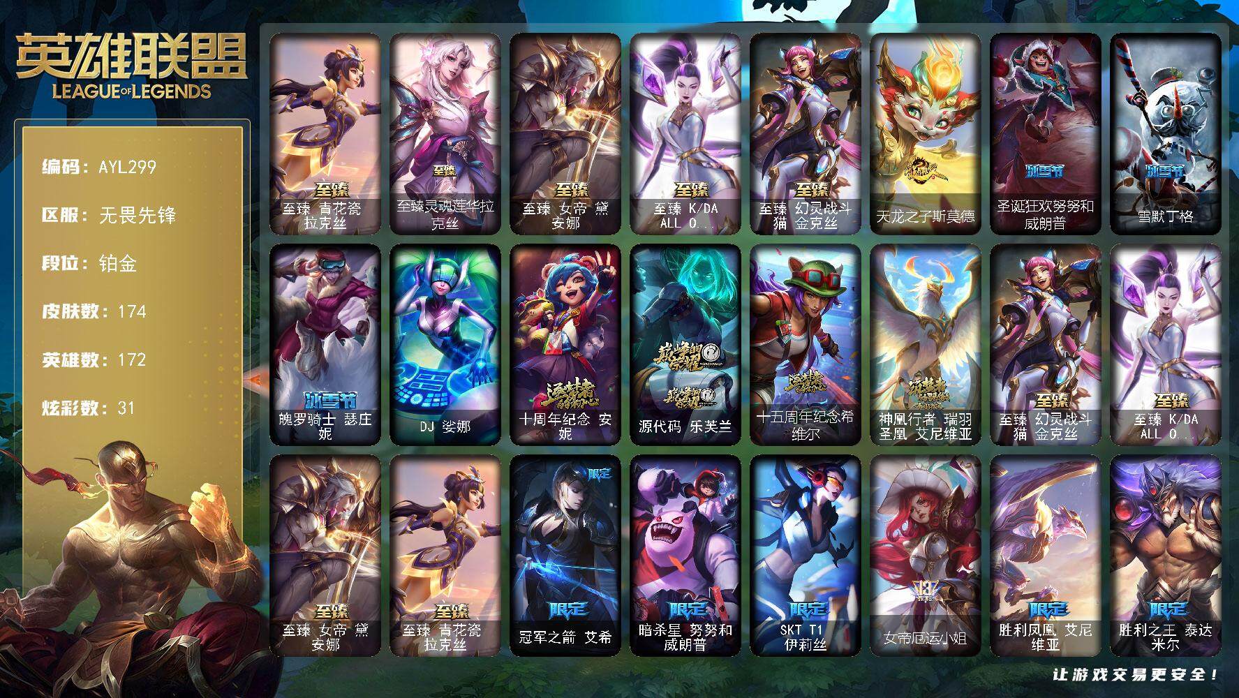 【293803】[15506194]可二次【特价出售/店主推荐】铂金段位-172英雄-174皮肤-31炫彩-1终极-9神话-19限定-25传说-43史诗【至臻皮肤】:至臻青花瓷拉克丝,至臻灵魂莲华拉克丝,至臻女帝黛安娜,至臻KDAALLOUT卡莎,至臻幻灵战斗猫金克丝【臻彩皮肤】:无畏骑士瑟庄妮赤子初心,西部魔影卢锡安贝利尔之怠,可爱可爱粉红红布里茨,魔女阿卡丽虚荣【年限皮肤】:天龙之子斯莫德【