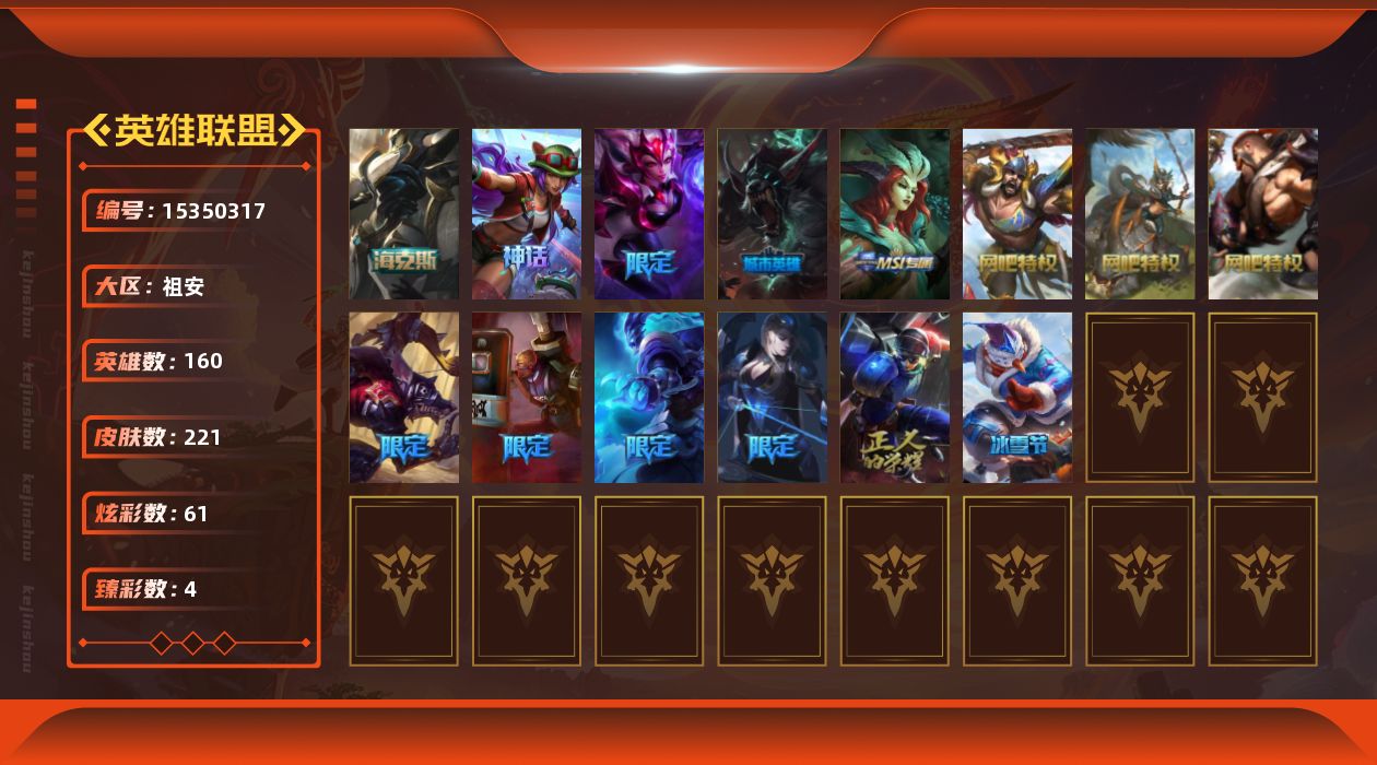 【293852】[15350317]t33736【祖安】黑龙瞎 221皮肤 61炫彩 4臻彩 3神话/33限定/23传说/160英雄 账号等级:307【重要头像】觅心之翼奎因 万圣节卡特琳娜 KDA萨勒芬妮 魄罗宇航员 【重要皮肤】零之枪骑赫卡里姆 胜利女神希维尔 胜利之王泰达米尔 胜利巨口克格莫 龙的传人李青 胜利之树茂凯 胜利机器人布里茨 胜利女神奥莉安娜 胜利枪神卢