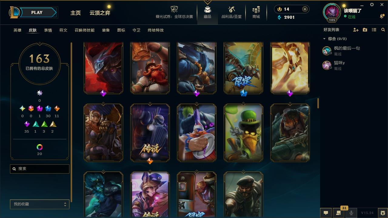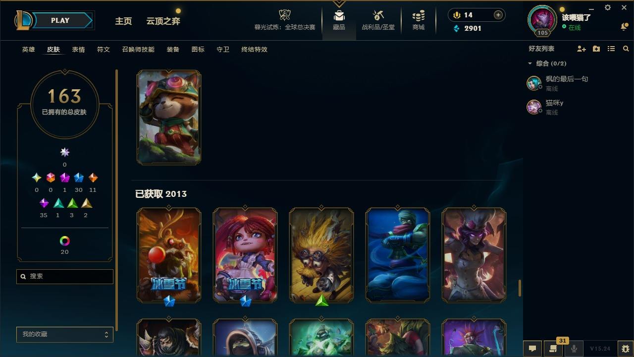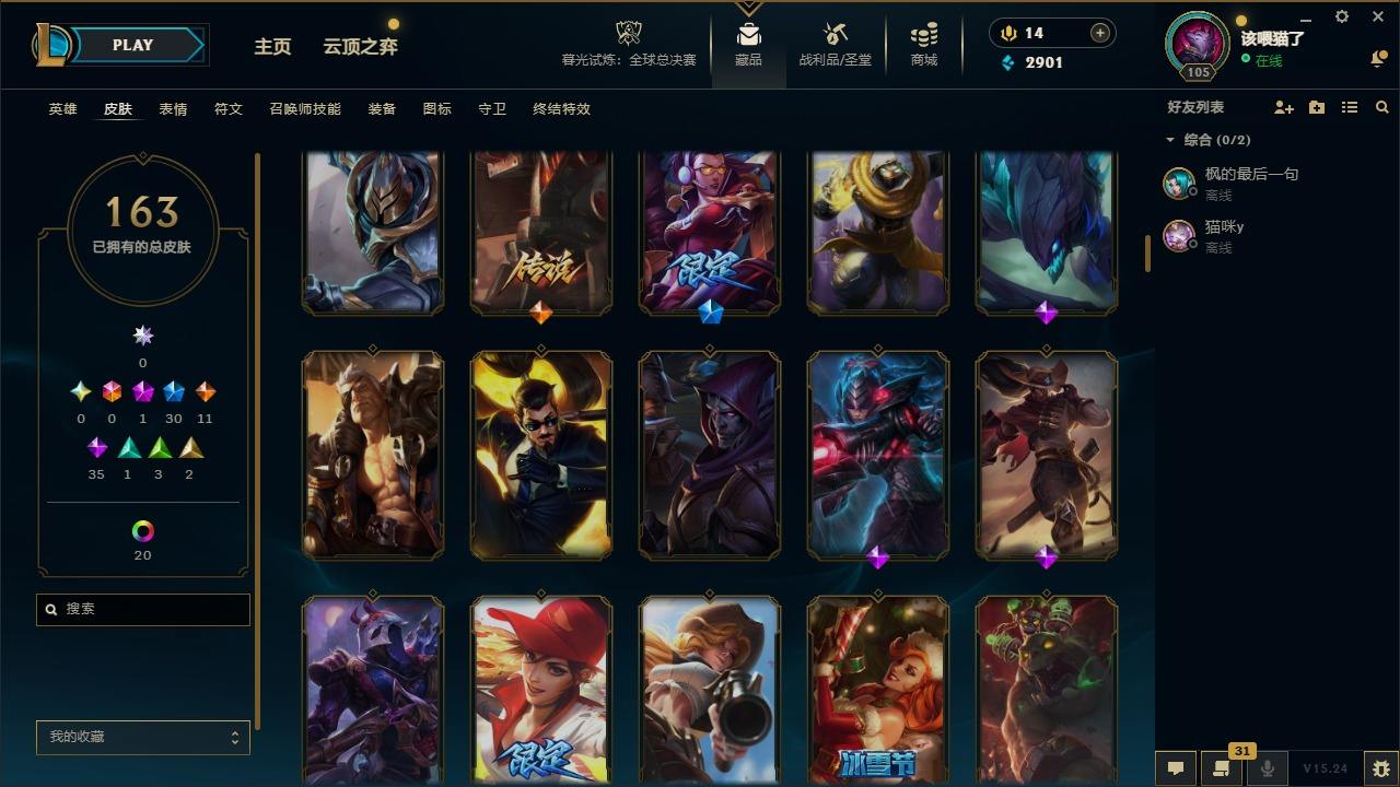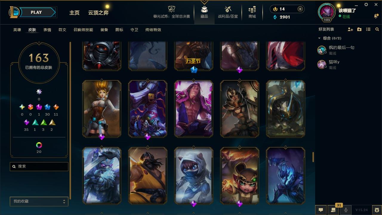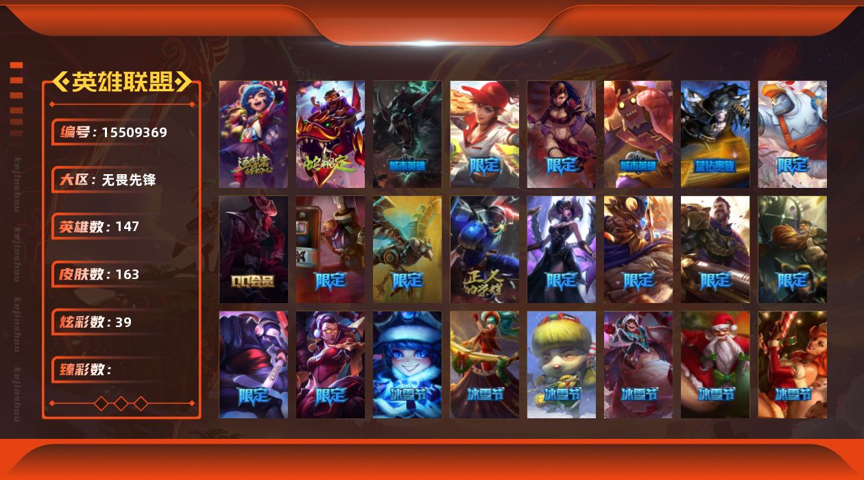 【294212】[15509369]1神话 30限定 11传说 35史诗 163皮肤 39炫彩 147英雄 可二次 可修改实名 【赛季限定皮】胜利女神 莫甘娜,胜利之树 茂凯,胜利枪神 格雷福斯【冠军限定系列】S1FNC 酒桶,S2 暗杀星 慎,S3 SKT T1 薇恩【冰雪节限定】寒冬精灵 璐璐,平安夜女神 娑娜,圣诞开心鬼 提莫,圣诞狂欢 努努和威朗普,圣诞老人 古拉加斯,圣诞糖果棒 厄运小