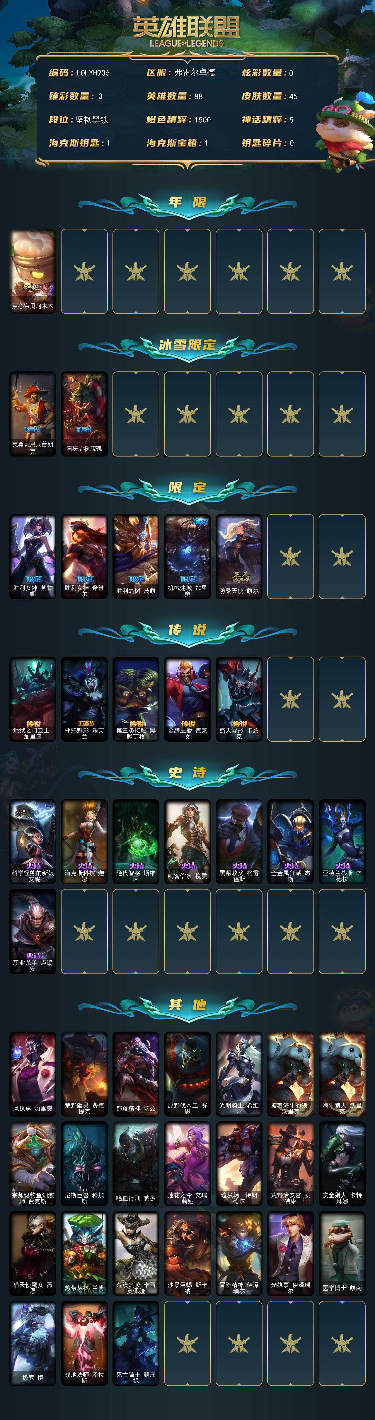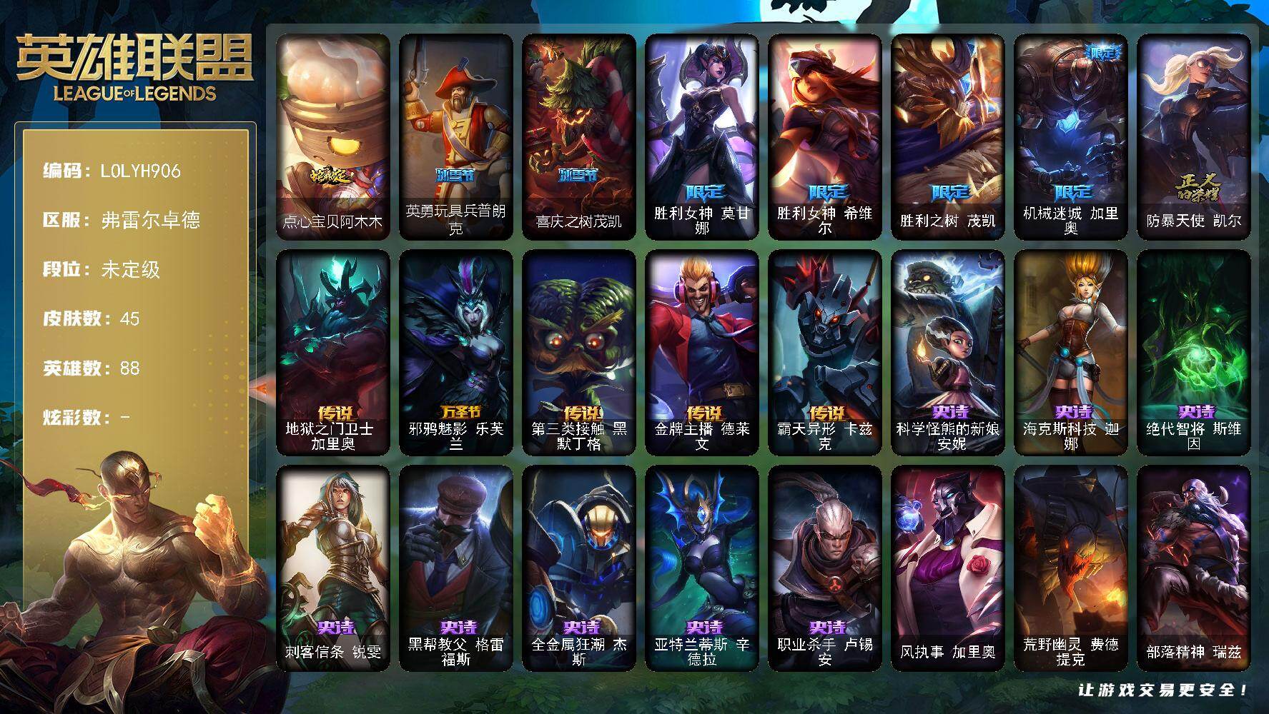 【294438】【LOLYH906】88英雄/45皮肤/8限定/5传说/8史诗/未定级/点心宝贝阿木木/英勇玩具兵普朗克/喜庆之树茂凯/胜利女神莫甘娜/胜利女神希维尔/胜利之树茂凯/机械迷城加里奥/防暴天使凯尔/地狱之门卫士加里奥/邪鸦魅影乐芙兰/第三类接触黑默丁格/金牌主播德莱文/霸天异形卡兹克/科学怪熊的新娘安妮/海克斯科技伽娜/绝代智将斯维因/刺客信条锐雯/黑帮教父格雷福斯/全金属狂潮杰斯
