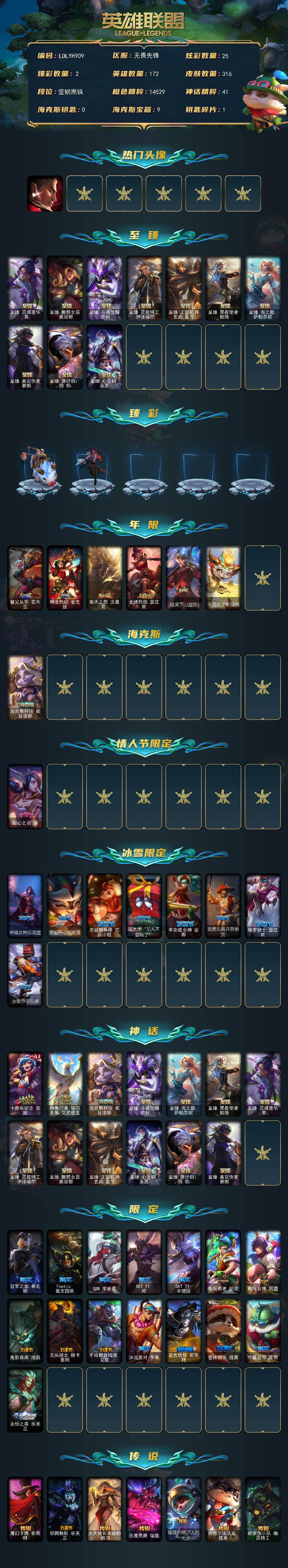 【294445】【LOLYH909】172英雄/316皮肤/13神话/30限定/2臻彩/25炫彩/29传说/72史诗/未定级账号等级:263/觅心游侠卢锡安/至臻灵魂莲华易/至臻魅惑女巫莫甘娜/至臻斗魂觉醒萨科/至臻灵能特工伊泽瑞尔/至臻王者机甲玄武盖伦/至臻黑夜使者凯隐/至臻海之歌萨勒芬妮/至臻真实伤害赛娜/至臻源计划:阴劫/至臻心之钢永恩/无畏骑士瑟庄妮赤子初心/西部魔影卢锡安贝利尔之怠/替