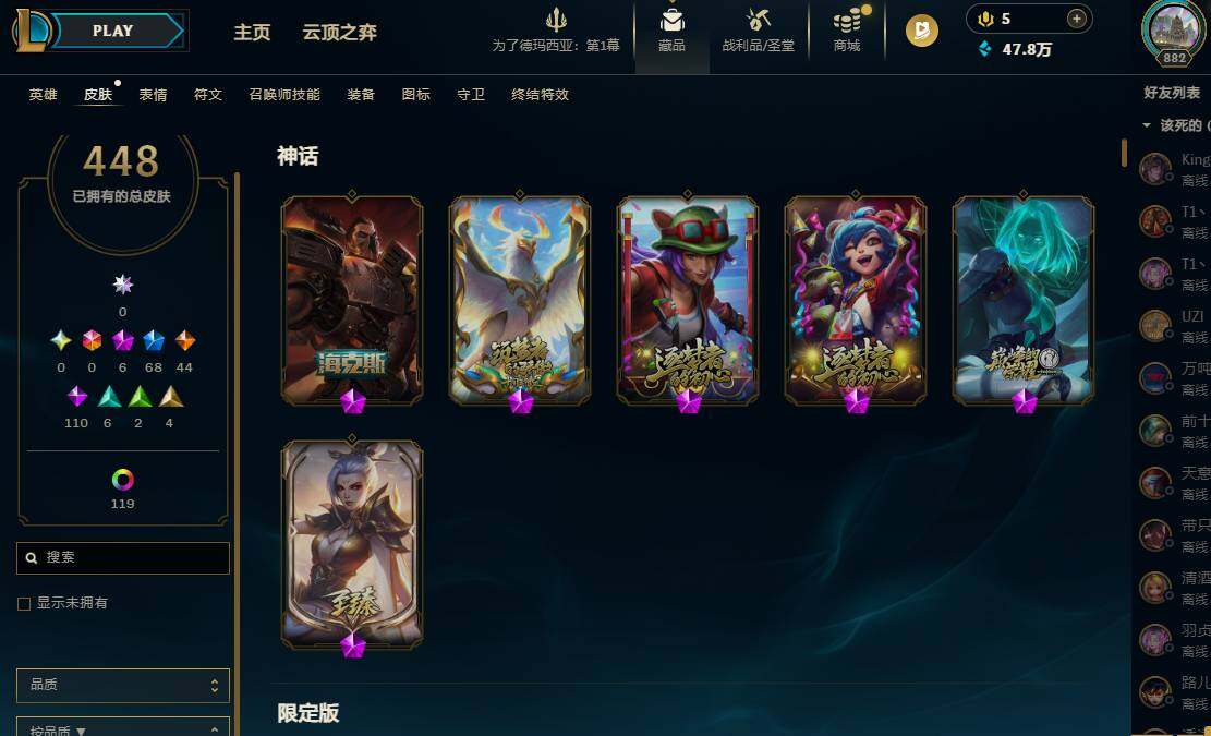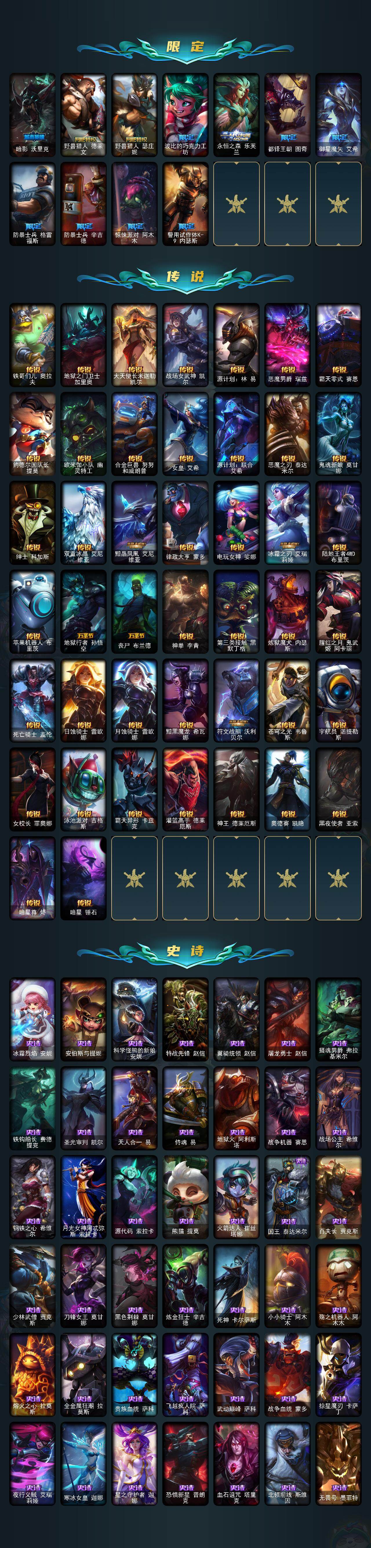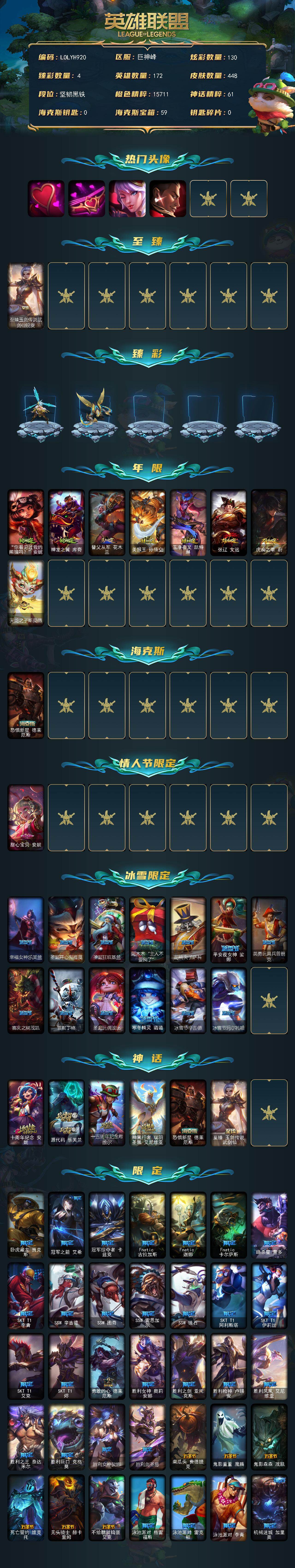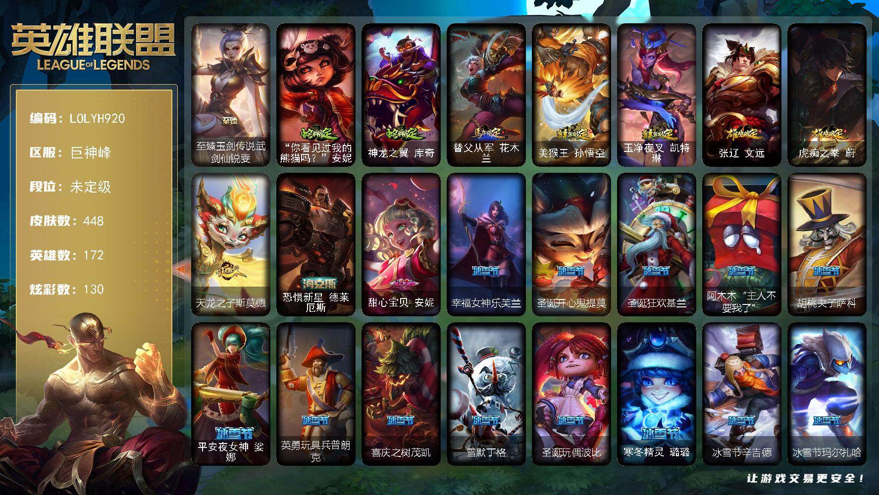 【294479】【LOLYH920】172英雄/448皮肤/6神话/68限定/4臻彩/130炫彩/44传说/110史诗/未定级账号等级:882/爱意绵绵/爱情之歌/觅心之翼奎因/觅心游侠卢锡安/至臻玉剑传说武剑仙/冰霜之刃艾瑞莉娅炫金/冠军掠夺者卡兹克凯旋圣装/红莲之刃锐雯/“你看见过我的熊猫吗?”安妮/神龙之翼库奇/替父从军花木兰/美猴王孙悟空/玉净夜叉凯特琳/张辽文远/虎痴之拳蔚/天龙之子斯