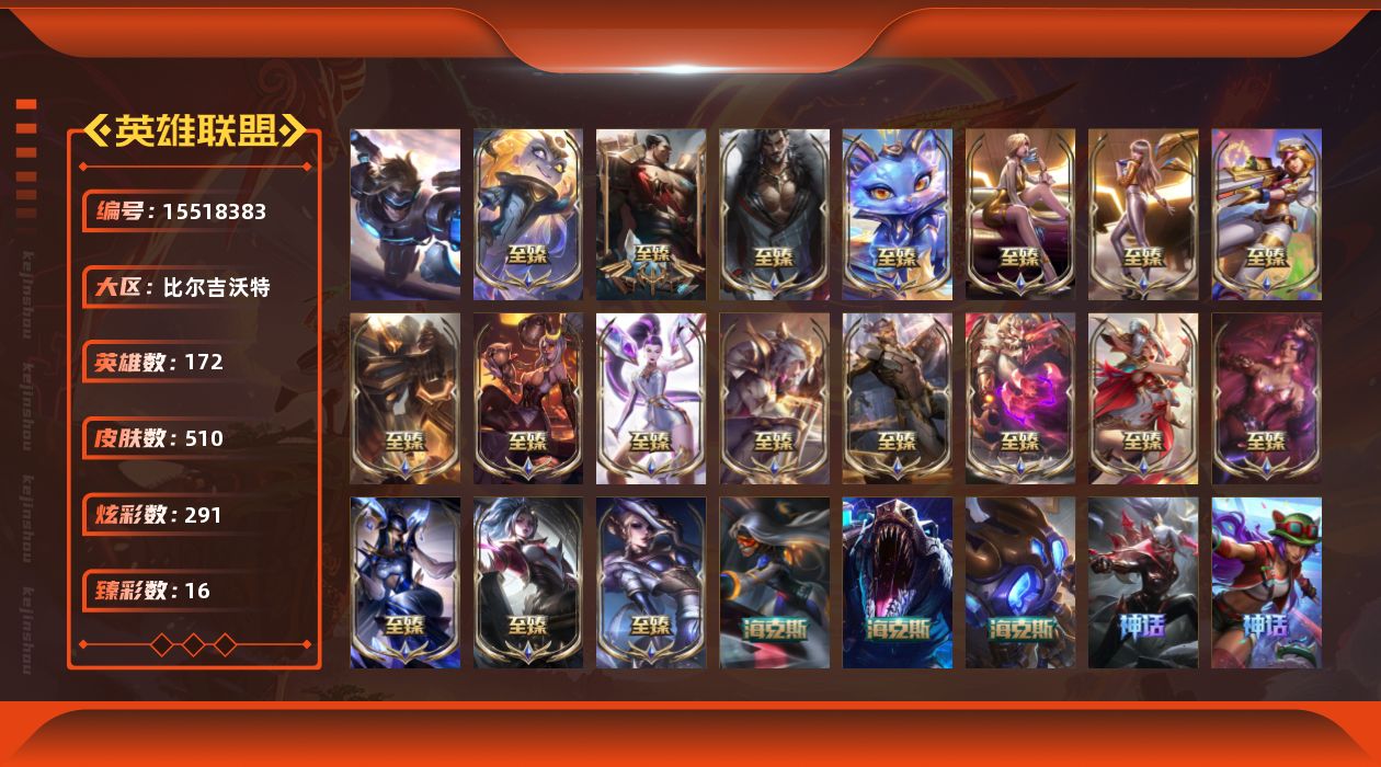 【295556】[15518383]t34051 皇冠账号【比尔吉沃特】510皮肤 291炫彩 16臻彩 27神话/78限定/62传说/172英雄 账号等级:1086【重要头像】心型钥匙 喜庆红包 救生圈 可爱安妮 战斗学院伊泽瑞尔神话炫彩 至臻青花瓷丽桑卓 【重要皮肤】机神玄武盖伦至臻 永恒星灵佐伊至臻 暗裔英雄嘉文四世至臻 凯旋将军德莱厄斯至臻 狼神英灵斯维因至臻 人工