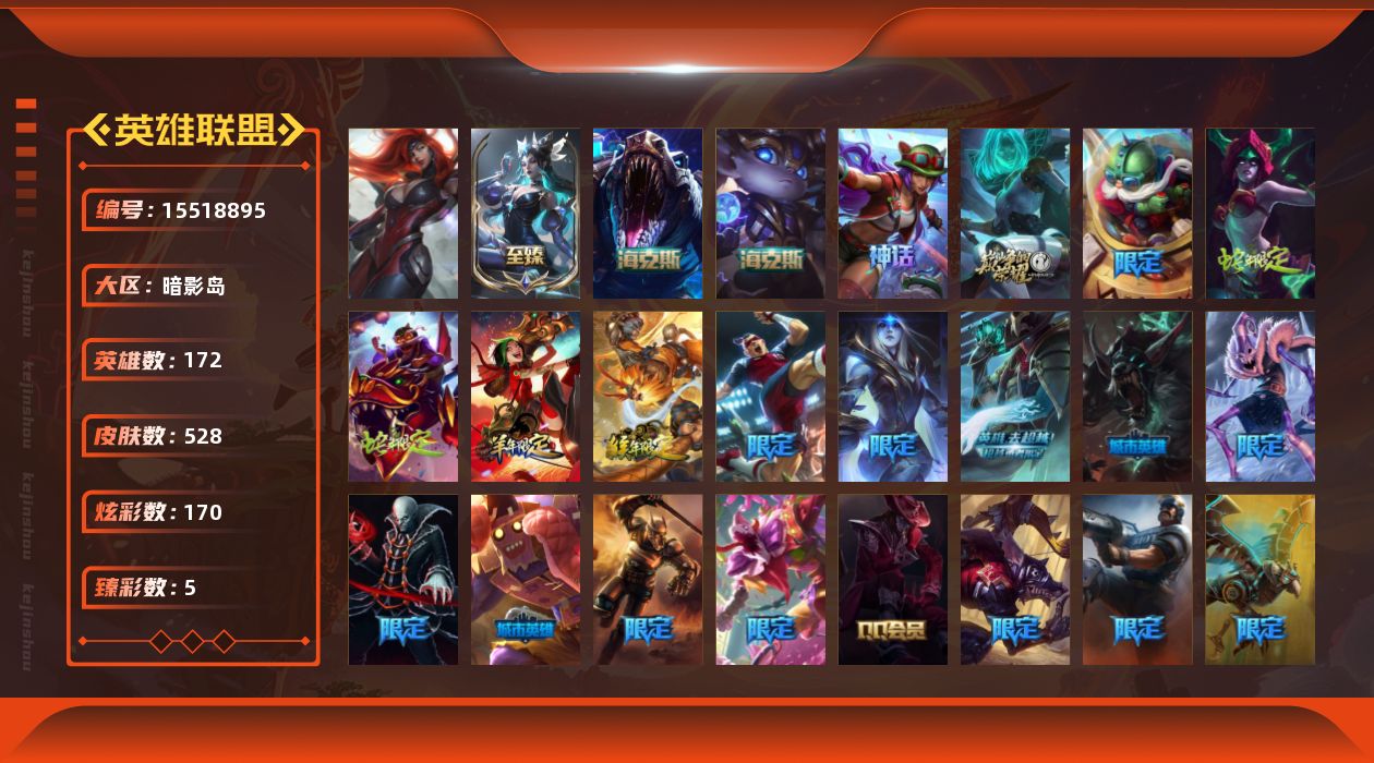 【295653】[15518895]t34076【暗影岛】528皮肤 170炫彩 5臻彩 7神话/66限定/44传说/172英雄 账号等级:1171【重要头像】雪花 救生圈 【重要皮肤】星之守护者辛德拉至臻 海克斯科技雷克顿 海克斯科技波比 胜利剑圣易 胜利女神娑娜 胜利之王泰达米尔 胜利巨口克格莫 创星之灵璐璐 荣誉使者玛尔扎哈 电玩勇者锐雯 神龙烈焰金克丝 碧玉之牙