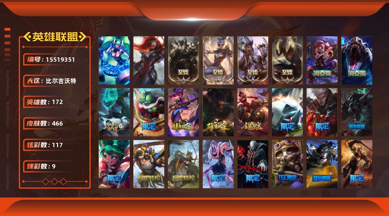 【295765】[15519351]t34075 皇冠账号【比尔吉沃特】原皮龙瞎 466皮肤 117炫彩 9臻彩 8神话/56限定/44传说/172英雄 账号等级:506【重要头像】披萨鸡 真实伤害赛娜 真实伤害赛娜炫彩 【重要皮肤】魅惑女巫厄运小姐至臻 玉剑传说武剑仙至臻 腥红之月亚托克斯至臻 黑夜使者李青至臻 海克斯科技安妮 海克斯科技雷克顿 生化领主泰达米尔 电玩勇者锐