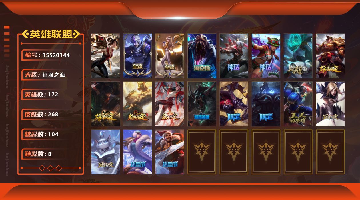 【295983】[15520144]t34083【征服之海】268皮肤 104炫彩 8臻彩 7神话/31限定/23传说/172英雄 账号等级:570【重要头像】心型钥匙 幼犬沃里克 【重要皮肤】殿堂传奇卡莎 灵魂莲华劫至臻 KDA一代卡莎至臻 殿堂传奇薇恩 海克斯科技雷克顿 胜利剑圣易 胜利女神娑娜 胜利之王泰达米尔 胜利巨口克格莫 点心宝贝阿木木 剪纸仙灵婕拉 北辰之