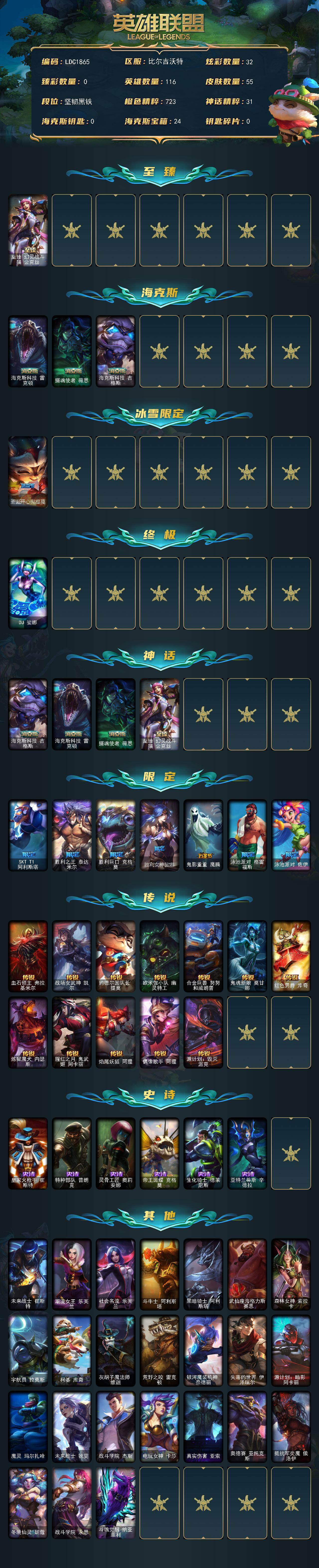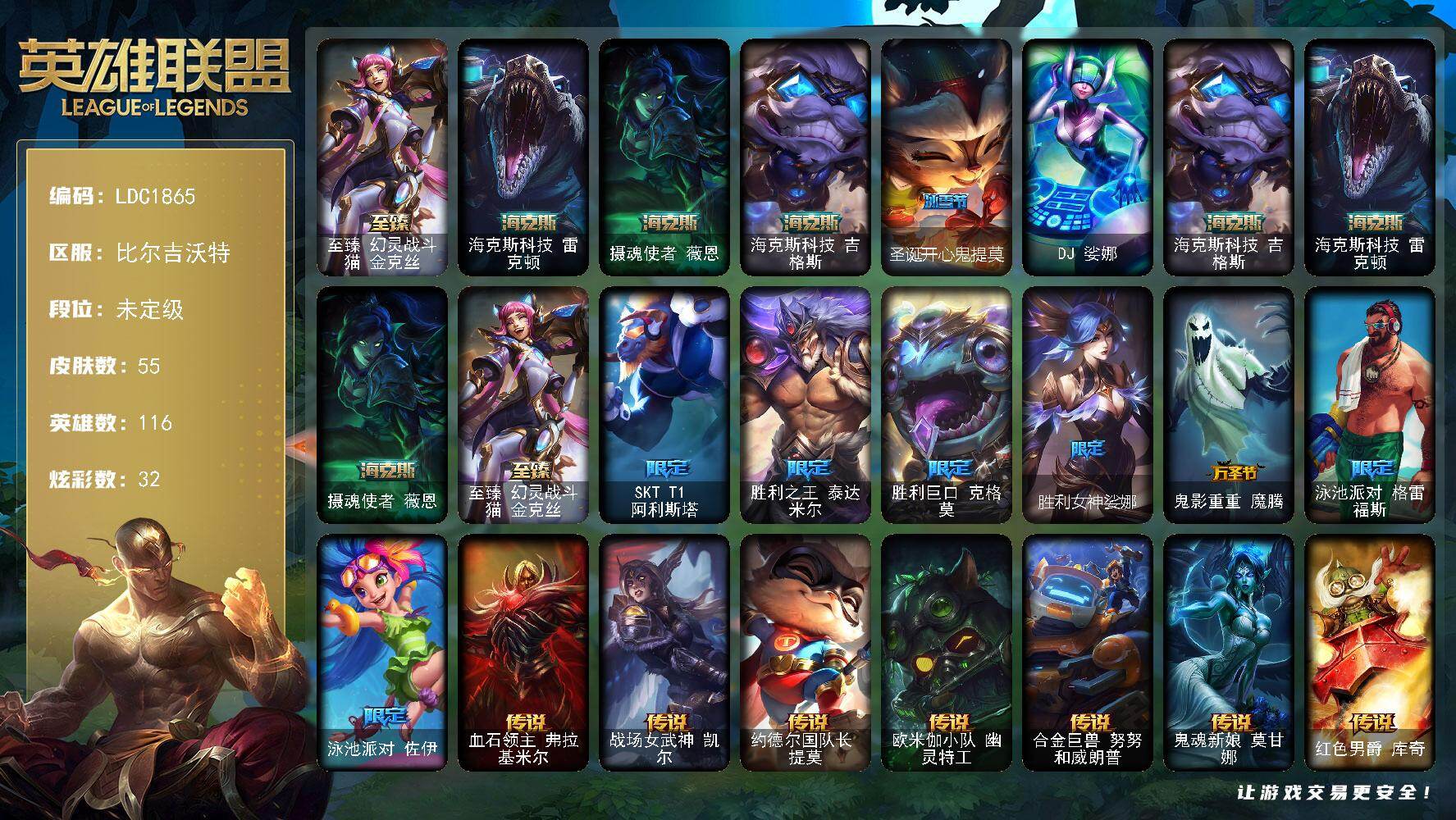 【296028】【LDC1865】116英雄/55皮肤/1终极/4神话/8限定/32炫彩/12传说/6史诗/未定级/至臻幻灵战斗猫金克丝/海克斯科技雷克顿/摄魂使者薇恩/海克斯科技吉格斯/圣诞开心鬼提莫/DJ娑娜/SKTT1阿利斯塔/胜利之王泰达米尔/胜利巨口克格莫/胜利女神娑娜/鬼影重重魔腾/泳池派对格雷福斯/泳池派对佐伊/血石领主弗拉基米尔/战场女武神凯尔/约德尔国队长提莫/欧米伽小队幽灵特