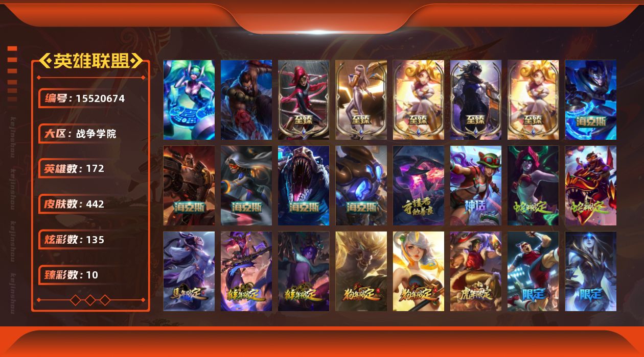 【296067】[15520674]t31182【战争学院】442皮肤 135炫彩 10臻彩 14神话/77限定/42传说/172英雄 账号等级:769 单双排段位:翡翠 【重要头像】爱情之歌 心型钥匙 救生圈 沐浴震惊 【重要皮肤】黑色玫瑰假面舞会卡特琳娜至臻 真实伤害赛娜至臻 KDA一代卡莎至臻 KDA卡莎2022至臻 星之守护者妮蔻至臻 海克斯科技雷克顿 海克斯科技嘉文四世 海克斯科技阿木