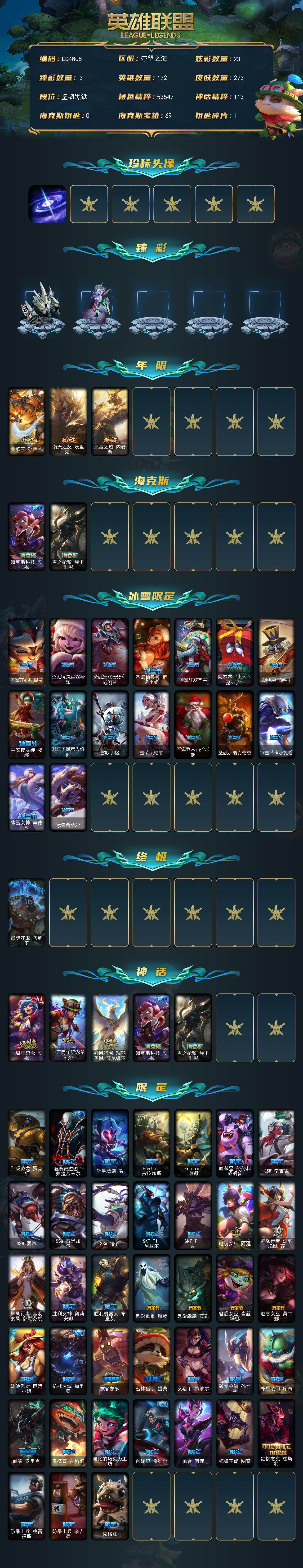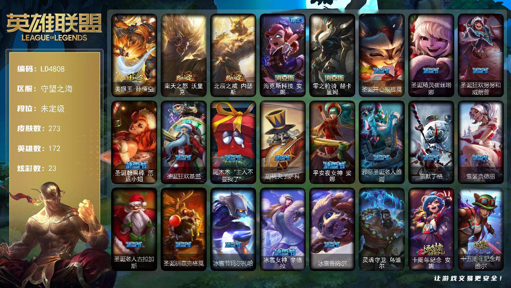 【296456】【LD4808】172英雄/273皮肤/1终极/5神话/57限定/3臻彩/23炫彩/34传说/65史诗/未定级账号等级:308/星界起源/霸天巨兽雪崩墨菲特/魔女阿卡丽虚荣/净雪之月莫甘娜冬虹/美猴王孙悟空/南天之怒沃里克/北辰之威内瑟斯/海克斯科技安妮/零之枪骑赫卡里姆/圣诞开心鬼提莫/圣诞精灵崔丝塔娜/圣诞狂欢努努和威朗普/圣诞糖果棒厄运小姐/圣诞狂欢基兰/阿木木:“主人不要