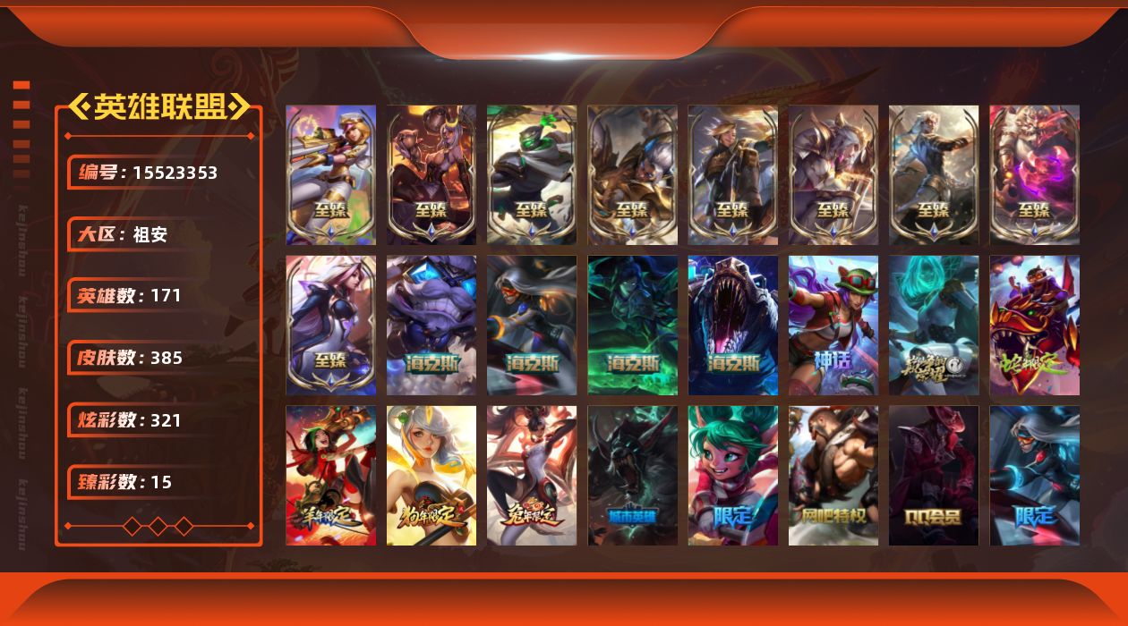 【296671】[15523353]t31197 皇冠账号【祖安】385皮肤 321炫彩 15臻彩 18神话/52限定/54传说/171英雄 账号等级:570 单双排段位:黄金 【重要头像】云顶战斗学院伊泽瑞尔 拓蛙 星守金克丝炫彩 剪纸仙灵希维尔炫彩 神龙烈焰金克丝炫彩 【重要皮肤】绝息圣堂厄运小姐至臻 女帝黛安娜至臻 灵能特工伊泽瑞尔至臻 神龙尊者炎龙瑟提至臻 黑夜使者凯隐至臻 神龙尊者均衡