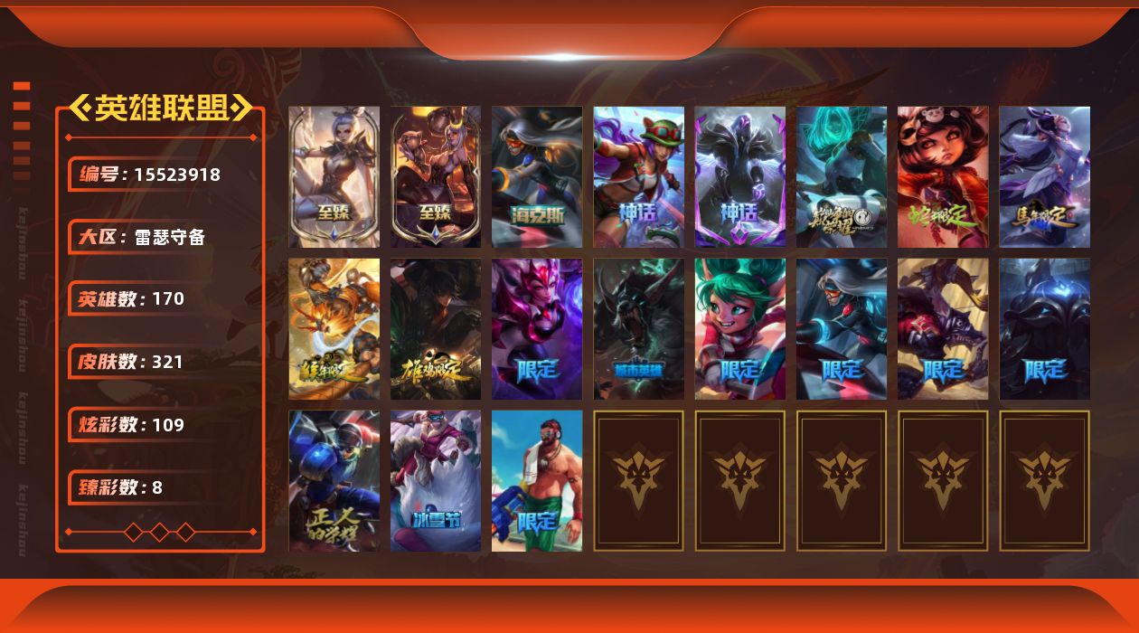 【296766】[15523918]t31195【雷瑟守备】黑龙瞎 321皮肤 109炫彩 8臻彩 8神话/41限定/37传说/170英雄 账号等级:961 单双排段位:铂金 【重要皮肤】烈焰美人薇恩至臻 玉剑传说武剑仙至臻 灰烬骑士派克 新创战纪希维尔 胜利剑圣易 胜利女神娑娜 胜利之王泰达米尔 胜利巨口克格莫 荣誉使者玛尔扎哈 电玩女神阿狸 星之守护者佐伊 龙的传人李青 银龙裁决泰隆 天龙之