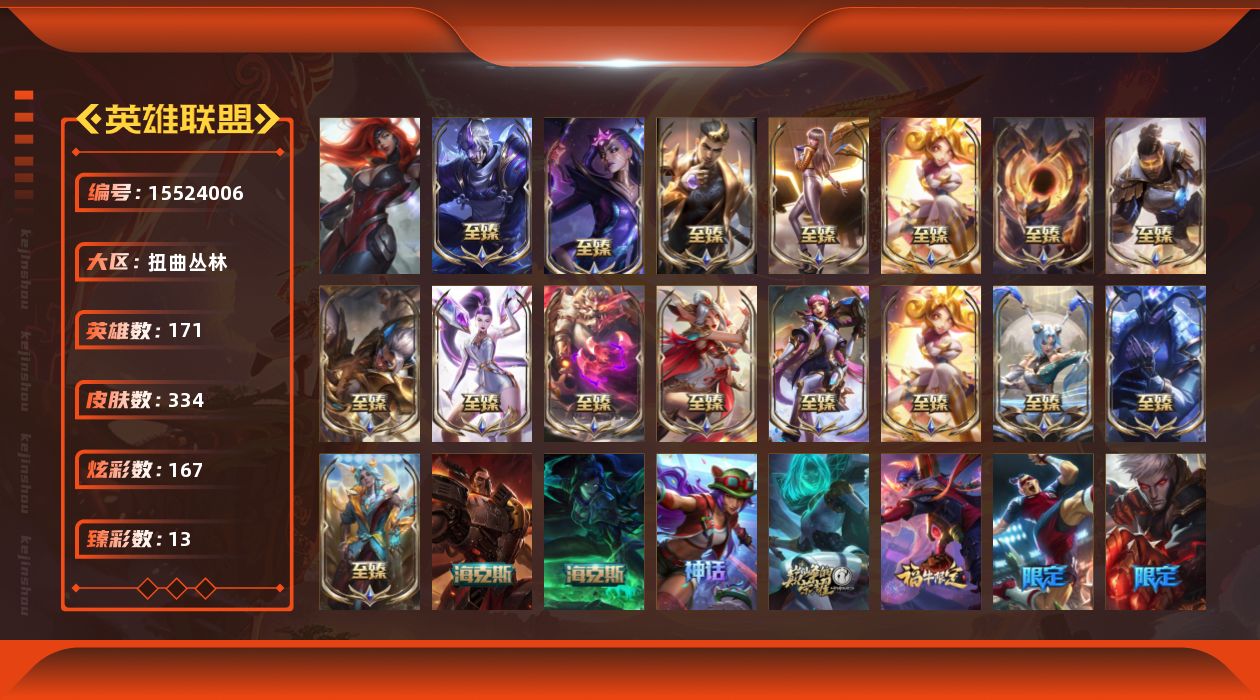 【296785】[15524006]t34125【扭曲丛林】 334皮肤 167炫彩 13臻彩 23神话/47限定/37传说/171英雄 账号等级:468【重要头像】云顶战斗学院伊泽瑞尔 大家伙 魄罗宇航员 星守金克丝炫彩 【重要皮肤】暗裔英雄嘉文四世至臻 灵魂莲华劫至臻 暗星女王黛安娜至臻 T1杰斯至臻 天龙之子伊泽瑞尔至臻 玉剑传说琴仙子至臻 DRX亚托克斯至臻 幻灵战