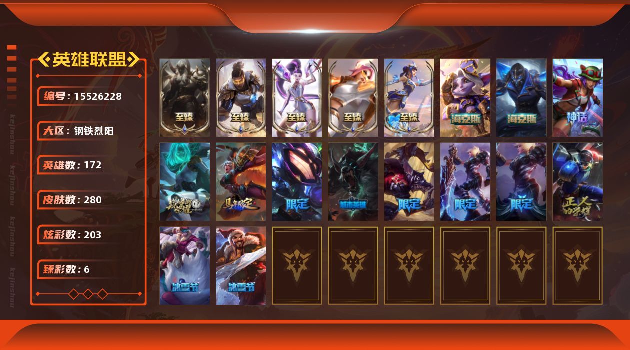 【297221】[15526228]t34117【钢铁烈阳】280皮肤 203炫彩 6臻彩 12神话/32限定/26传说/172英雄 账号等级:983【重要头像】魔女卡西奥佩娅炫彩 可爱安妮 至臻福牛守护者菲奥娜 【重要皮肤】青花瓷拉克丝至臻 未来战士卢锡安至臻 福牛守护者菲奥娜至臻 KDA二代卡莎至臻 腥红之月亚托克斯至臻 腥红之月亚托克斯2022至臻 海克斯科技崔丝塔娜