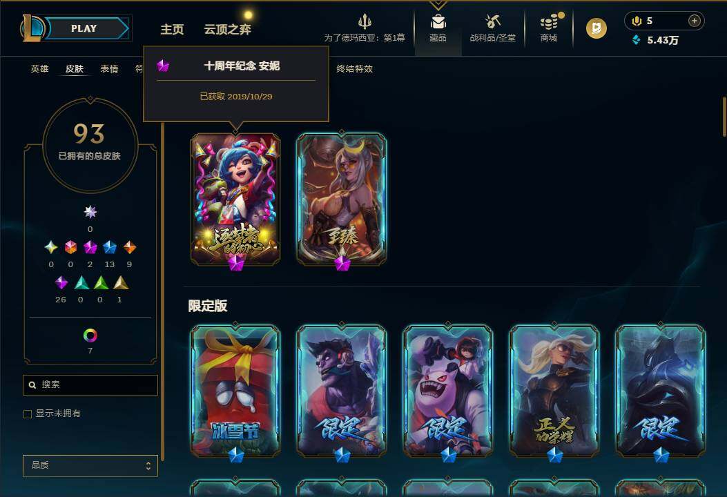 【298306】【LSA1372】101英雄/93皮肤/2神话/13限定/2臻彩/8炫彩/9传说/26史诗/未定级账号等级:223/至臻烈焰美人薇恩/吕布奉先炫金战神/张辽文远炫金将军/替父从军花木兰/张辽文远/幸福女神乐芙兰/圣诞开心鬼提莫/阿木木:“主人不要我了”/邪恶圣诞老人维迦/喜庆之树茂凯/十周年纪念安妮/冠军之隐劫/暗杀星蒙多/暗杀星努努和威朗普/胜利女神菲奥娜/魅惑女巫奈德丽/防暴