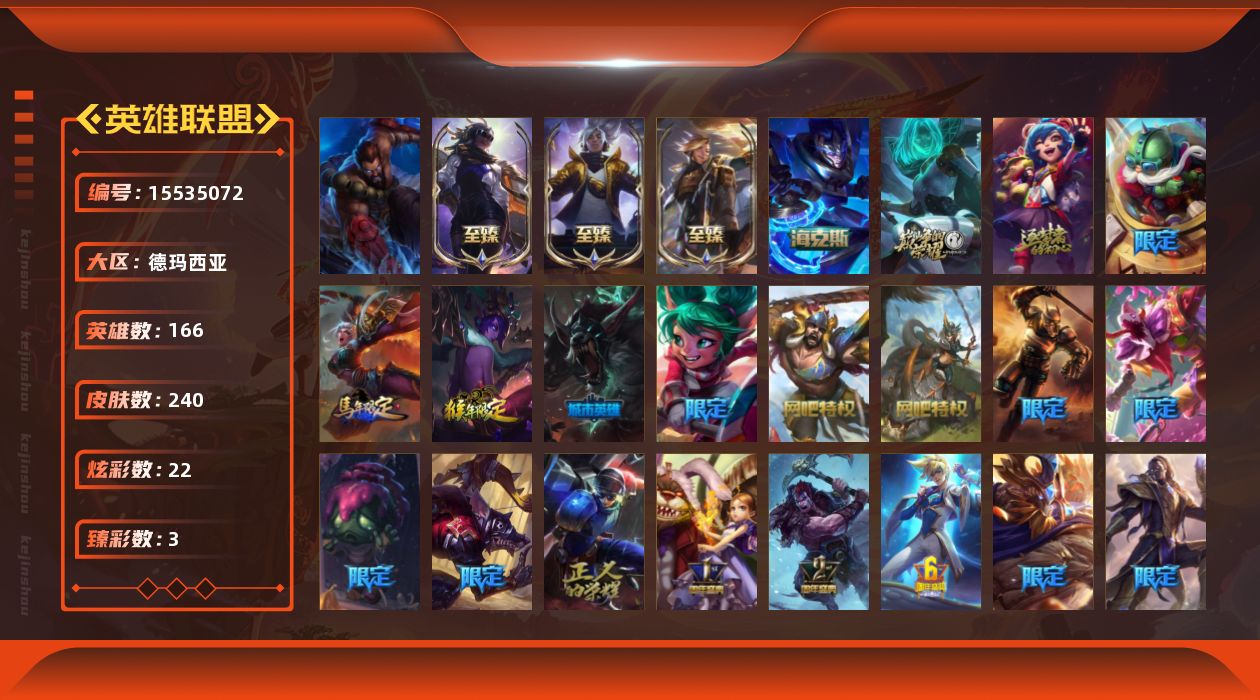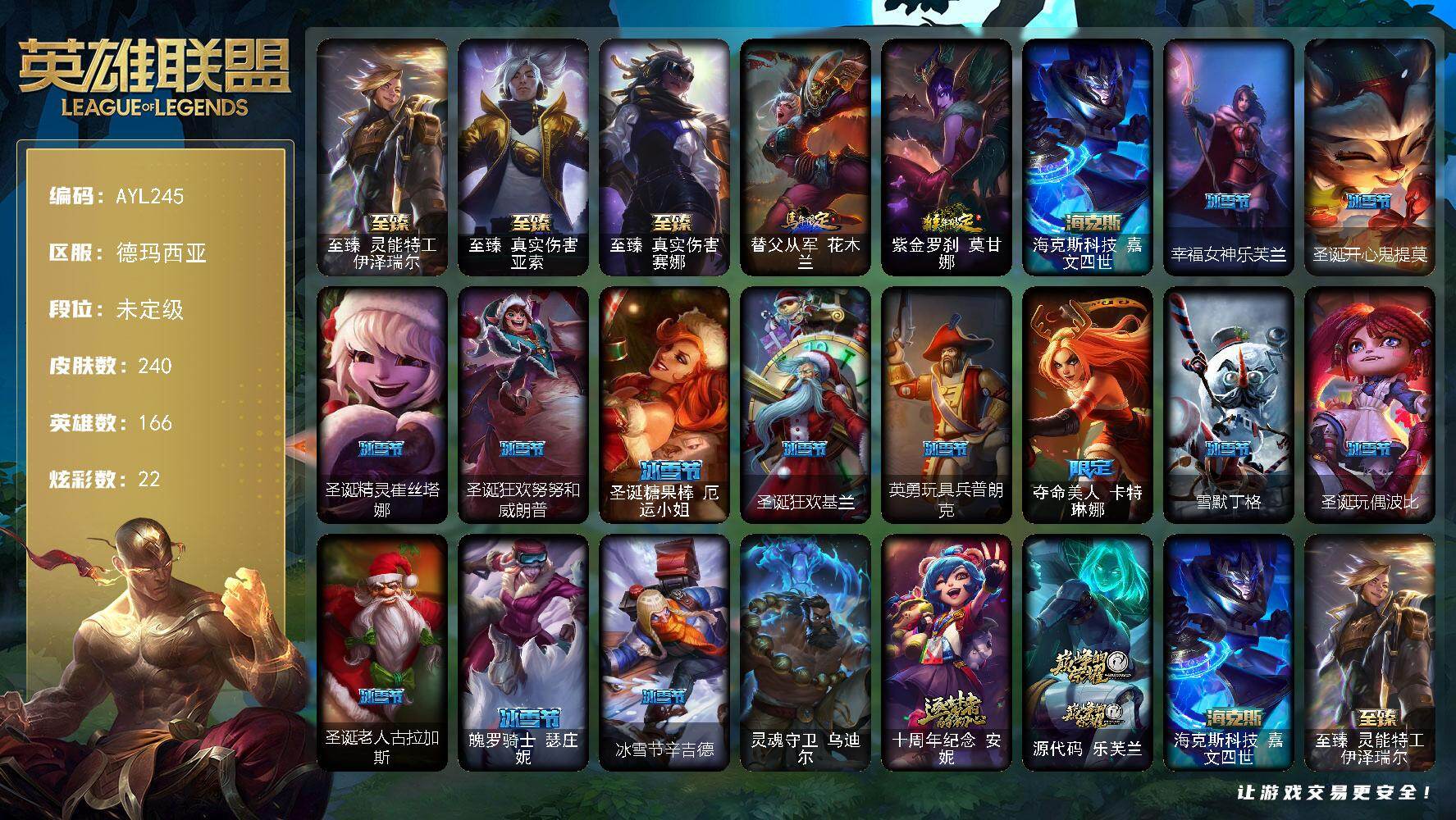 【298631】[15535072]可二次【特价出售/店主推荐】未定级段位-166英雄-240皮肤-22炫彩-1终极-6神话-39限定-29传说-55史诗【至臻皮肤】:至臻灵能特工伊泽瑞尔,至臻真实伤害亚索,至臻真实伤害赛娜【臻彩皮肤】:无畏骑士瑟庄妮赤子初心,神龙尊者圣龙李青龙腾云起,玉剑传说寒潭夭夭胭脂【年限皮肤】:替父从军花木兰,紫金罗刹莫甘娜【海克斯皮肤】:海克斯科技嘉文四世【冰雪限定】