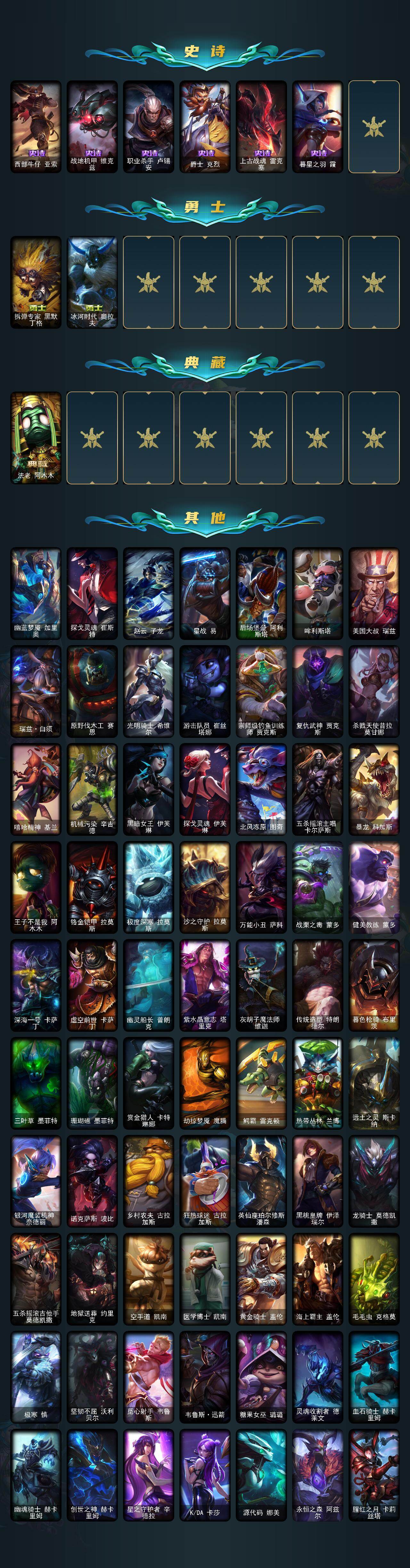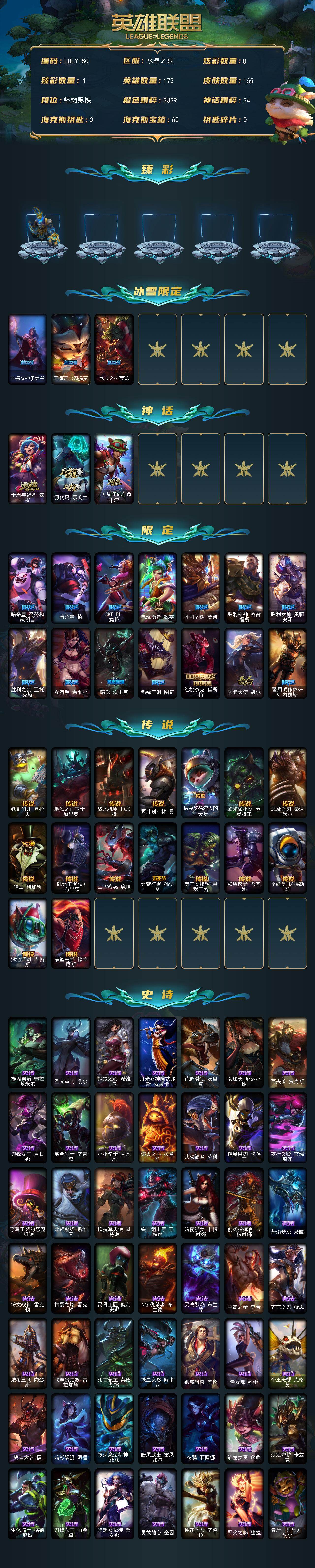 【298670】【LOLYT80】172英雄/165皮肤/3神话/17限定/1臻彩/8炫彩/16传说/55史诗/未定级/冠军典狱长锤石凯旋圣装/幸福女神乐芙兰/圣诞开心鬼提莫/喜庆之树茂凯/十周年纪念安妮/源代码乐芙兰/十五周年纪念希维尔/暗杀星努努和威朗普/暗杀星慎/SKTT1婕拉/电玩勇者锐雯/胜利之树茂凯/胜利枪神格雷福斯/胜利女神奥莉安娜/胜利之剑亚托克斯/女猎手希维尔/暗影妖狐阿狸/都