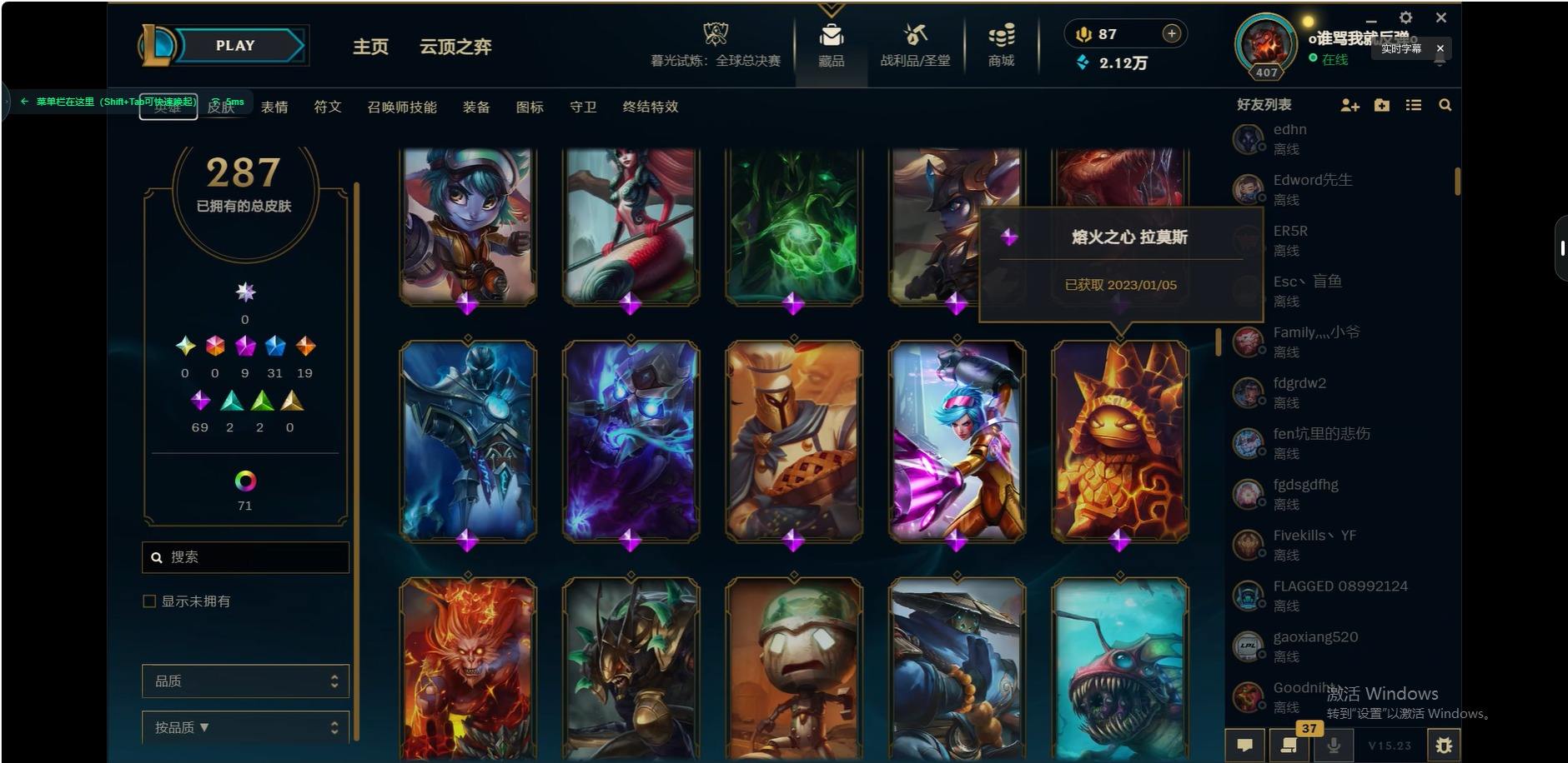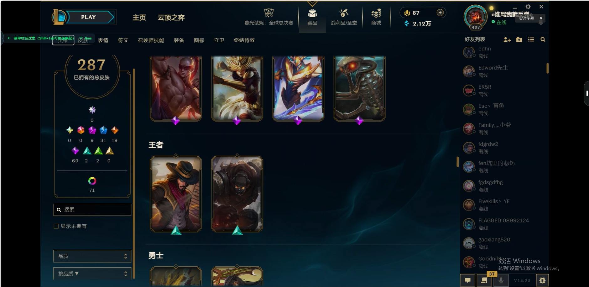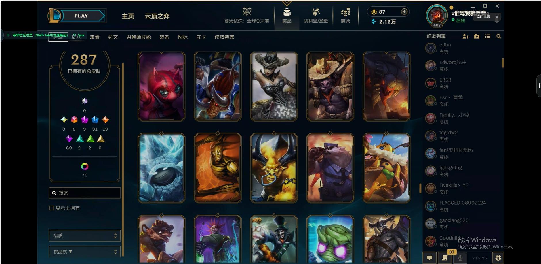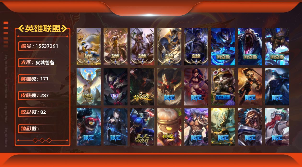 【299047】[15537391]9神话 31限定 19传说 69史诗 287皮肤 82炫彩 171英雄 可二次 可修改实名 【至臻】:至臻 墨之影武者 亚索,至臻 绒毛菲兹,至臻 K/DA 阿狸,至臻 魅惑女巫 厄运小姐,至臻 飞升战神 潘森【海克斯】:海克斯 嘉文四世,海克斯 雷克顿,海克斯 阿利斯塔【赛季限定皮】:胜利之王 泰达米尔【冠军限定系列】:S1FNC 迦娜,S4 SSW 雷恩加