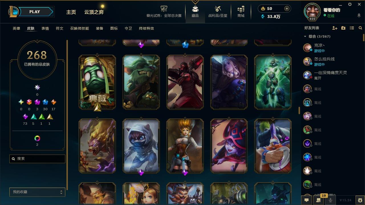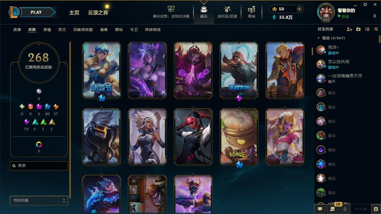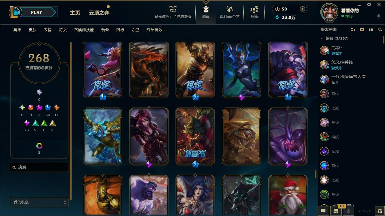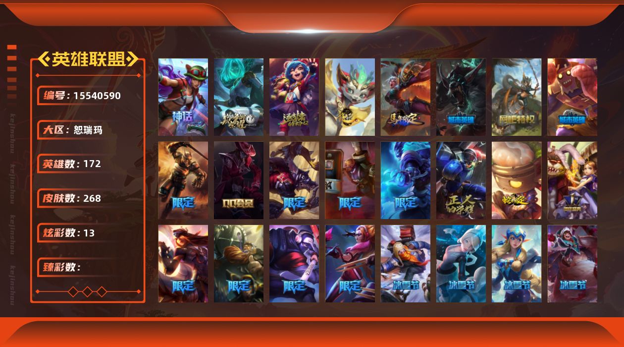 【299650】[15540590]3神话 30限定 17传说 73史诗 268皮肤 13炫彩 172英雄 可二次 可修改实名 【赛季限定皮】胜利女神 希维尔 【冠军限定系列】S2 暗杀星 慎,S1FNC 酒桶,S3 SKT T1 婕拉 【冰雪节限定】圣诞玩偶 波比,雪默丁格,圣诞糖果棒 厄运小姐,圣诞狂欢 努努和威朗普,幸福女神 乐芙兰,冬季仙境 发条,冰雪节 辛吉德,圣诞老人 古拉加斯,冬境