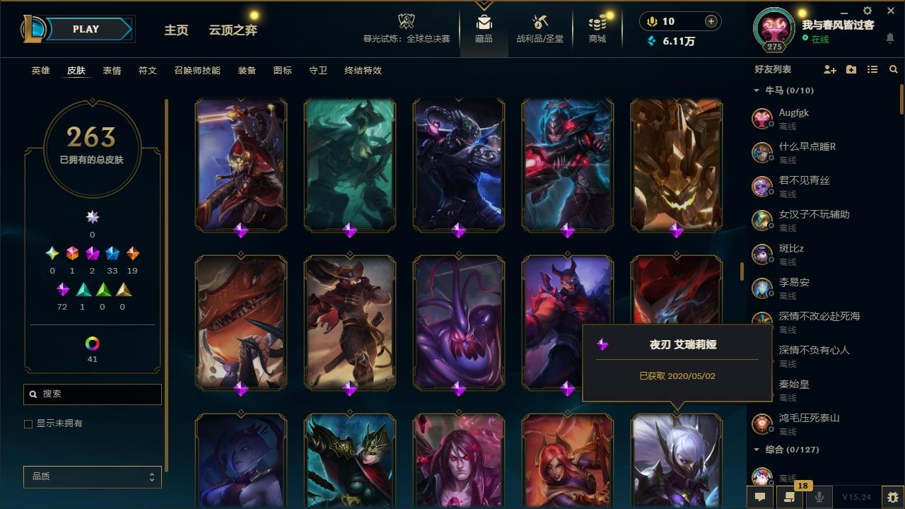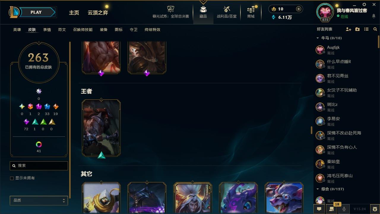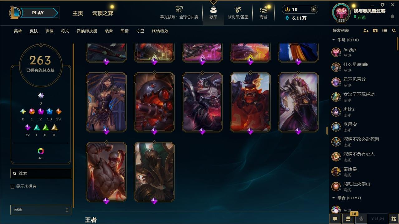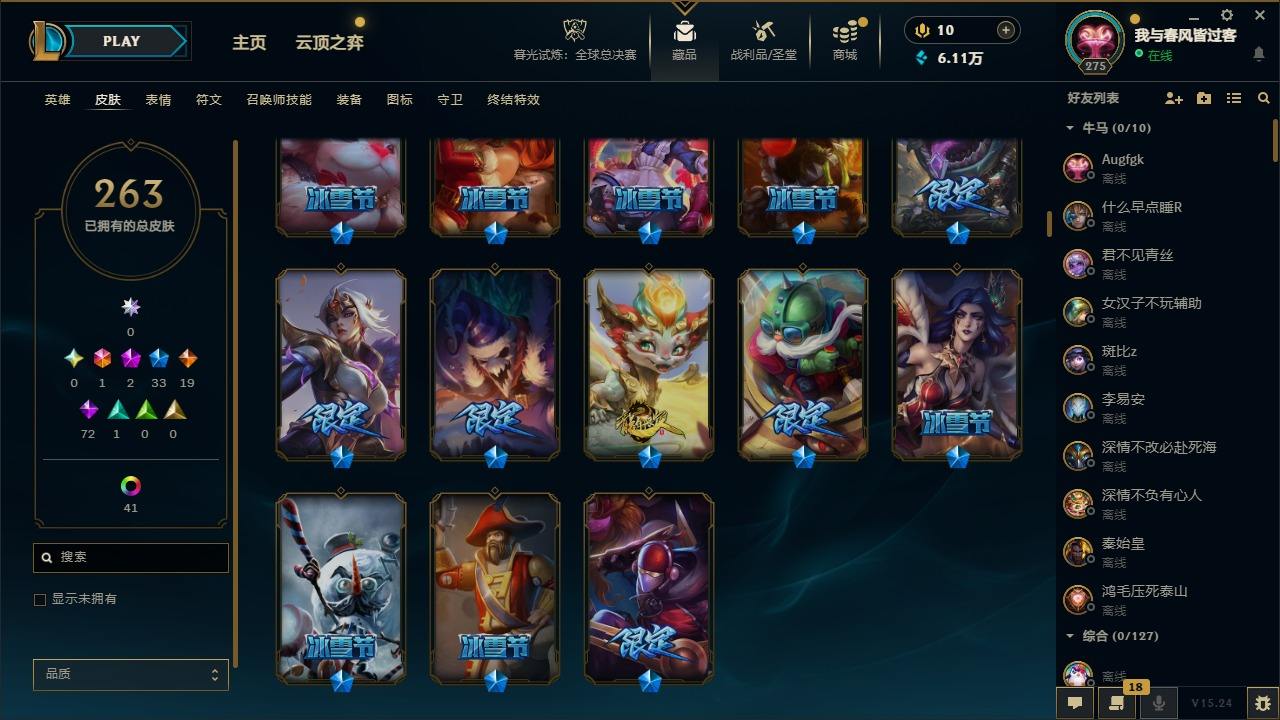 【299663】[15540493]1终极 2神话 33限定 19传说 72史诗 263皮肤 50炫彩 172英雄 可二次 可修改实名 【赛季限定皮】胜利巨口 克格莫,胜利女神-菲奥娜 【冠军限定系列】S3 SKT T1 劫,S2 暗杀星 蒙多,S2 暗杀星 伊泽瑞尔 【冰雪节限定】英勇玩具兵 普朗克,圣诞精灵 崔丝塔娜,圣诞开心鬼 提莫,圣诞玩偶 波比,魄罗骑士 瑟庄妮,雪默丁格,圣诞糖果棒