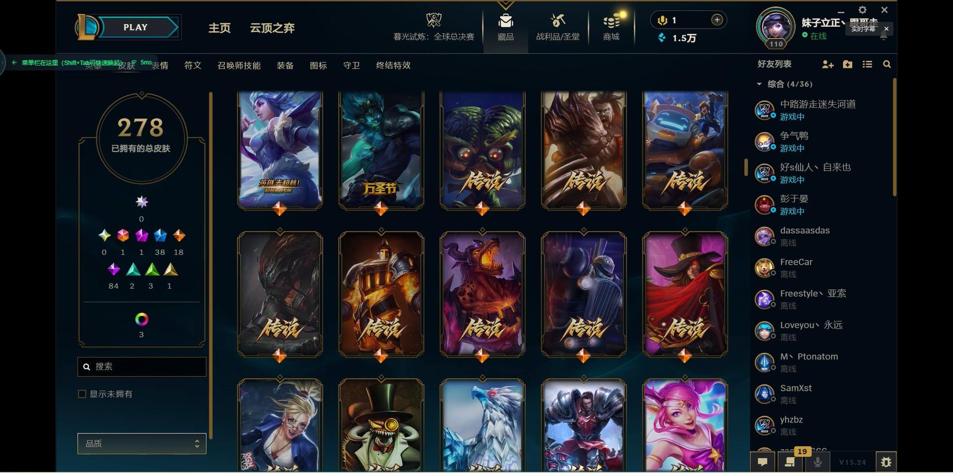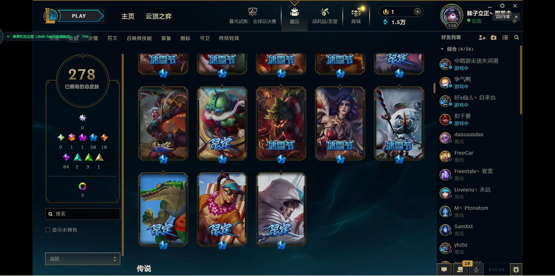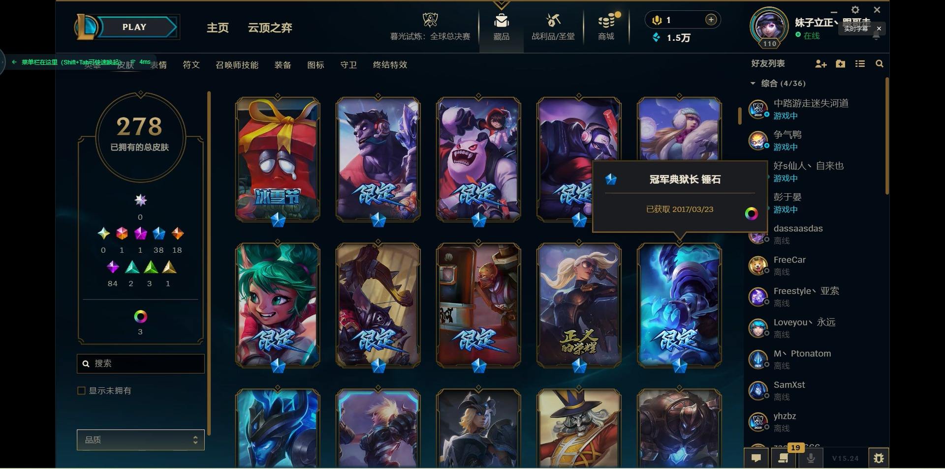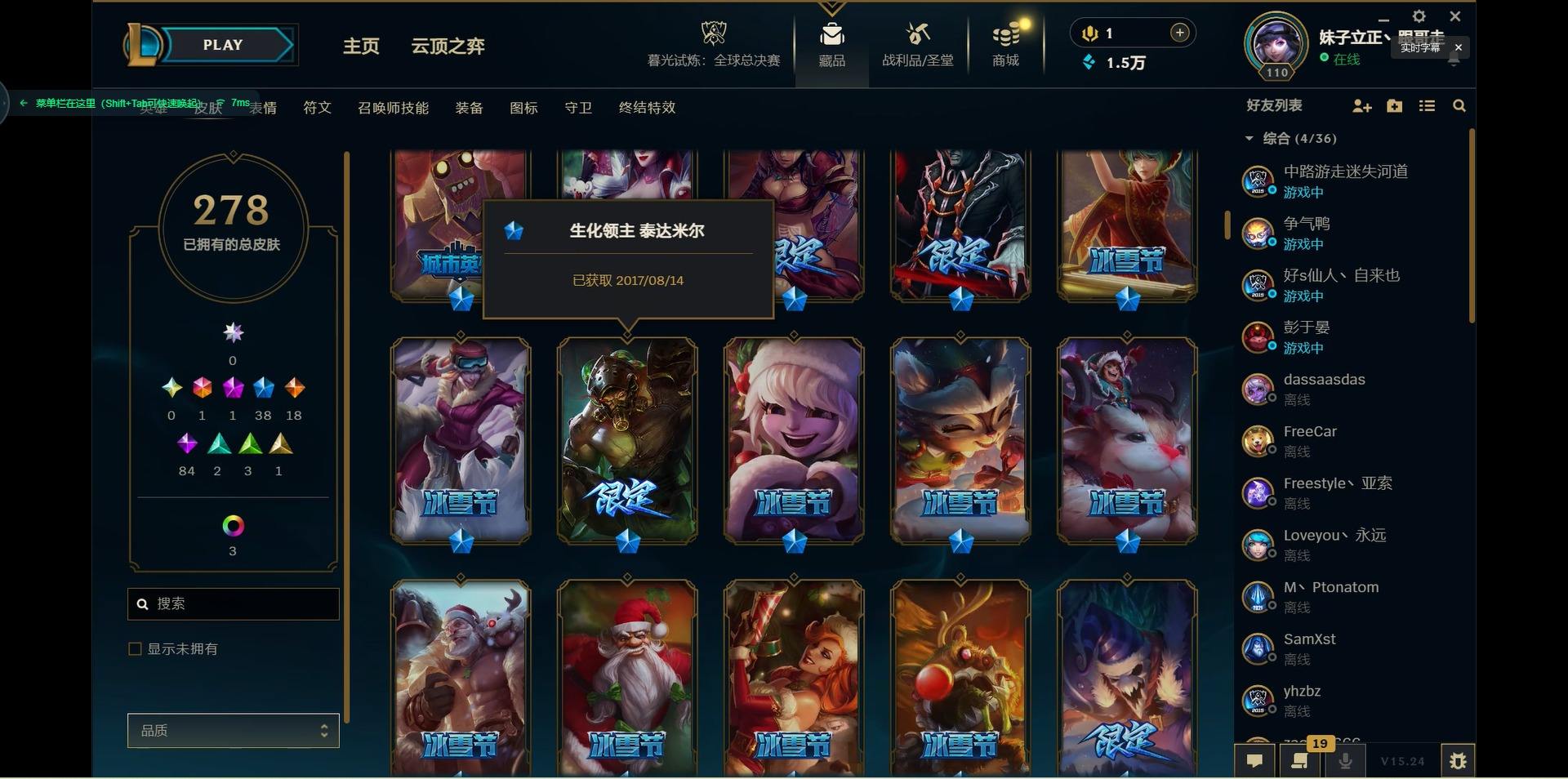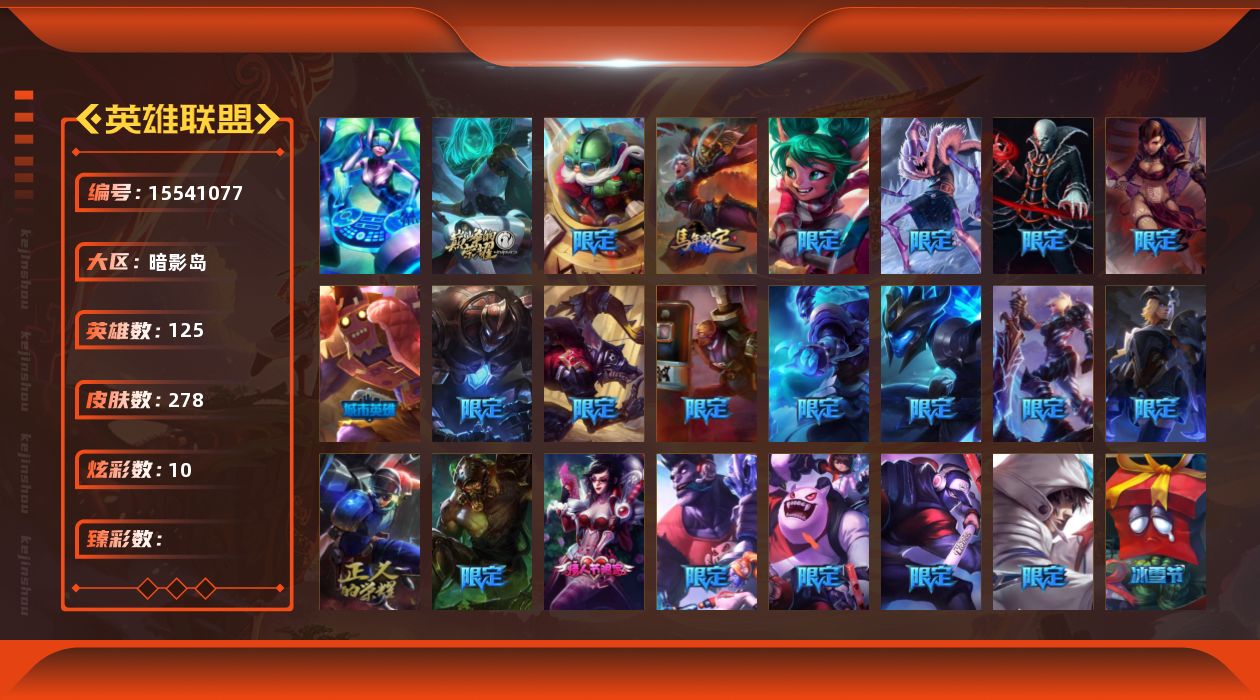 【299740】[15541077]1终极 1神话 38限定 18传说 84史诗 278皮肤 10炫彩 125英雄 可二次 可修改实名 【限定】:生化领主 泰达米尔【情人节限定】:觅心猎手 薇恩【冠军限定系列】:S2 暗杀星 蒙多,S2 暗杀星 努努,S2 暗杀星 慎,S4 SSW 泰隆【冰雪节限定】:阿木木:“主人不要我了”,冰雪女神 辛德拉,胡桃夹子 萨科,平安夜女神 娑娜,魄罗骑士 瑟庄妮