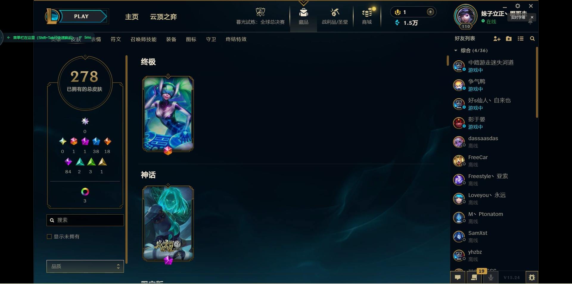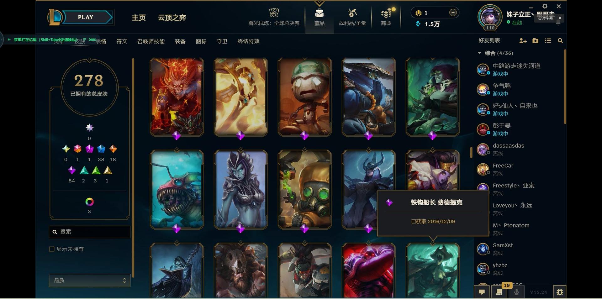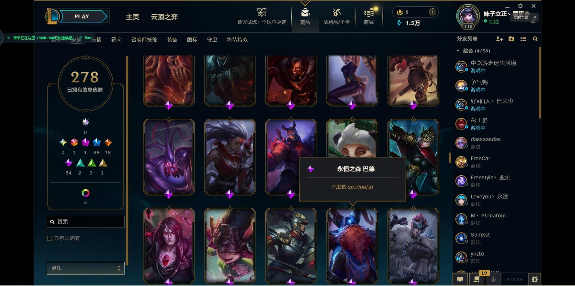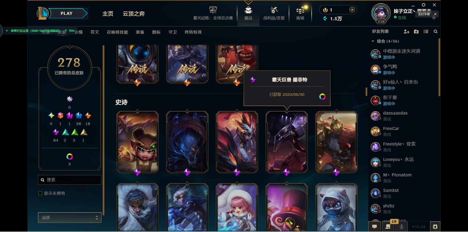 【299740】[15541077]1终极 1神话 38限定 18传说 84史诗 278皮肤 10炫彩 125英雄 可二次 可修改实名 【限定】:生化领主 泰达米尔【情人节限定】:觅心猎手 薇恩【冠军限定系列】:S2 暗杀星 蒙多,S2 暗杀星 努努,S2 暗杀星 慎,S4 SSW 泰隆【冰雪节限定】:阿木木:“主人不要我了”,冰雪女神 辛德拉,胡桃夹子 萨科,平安夜女神 娑娜,魄罗骑士 瑟庄妮