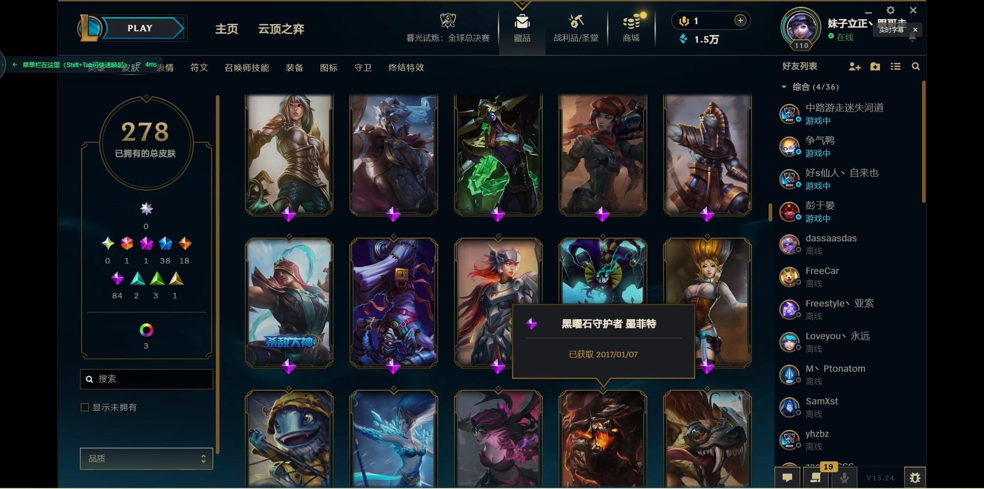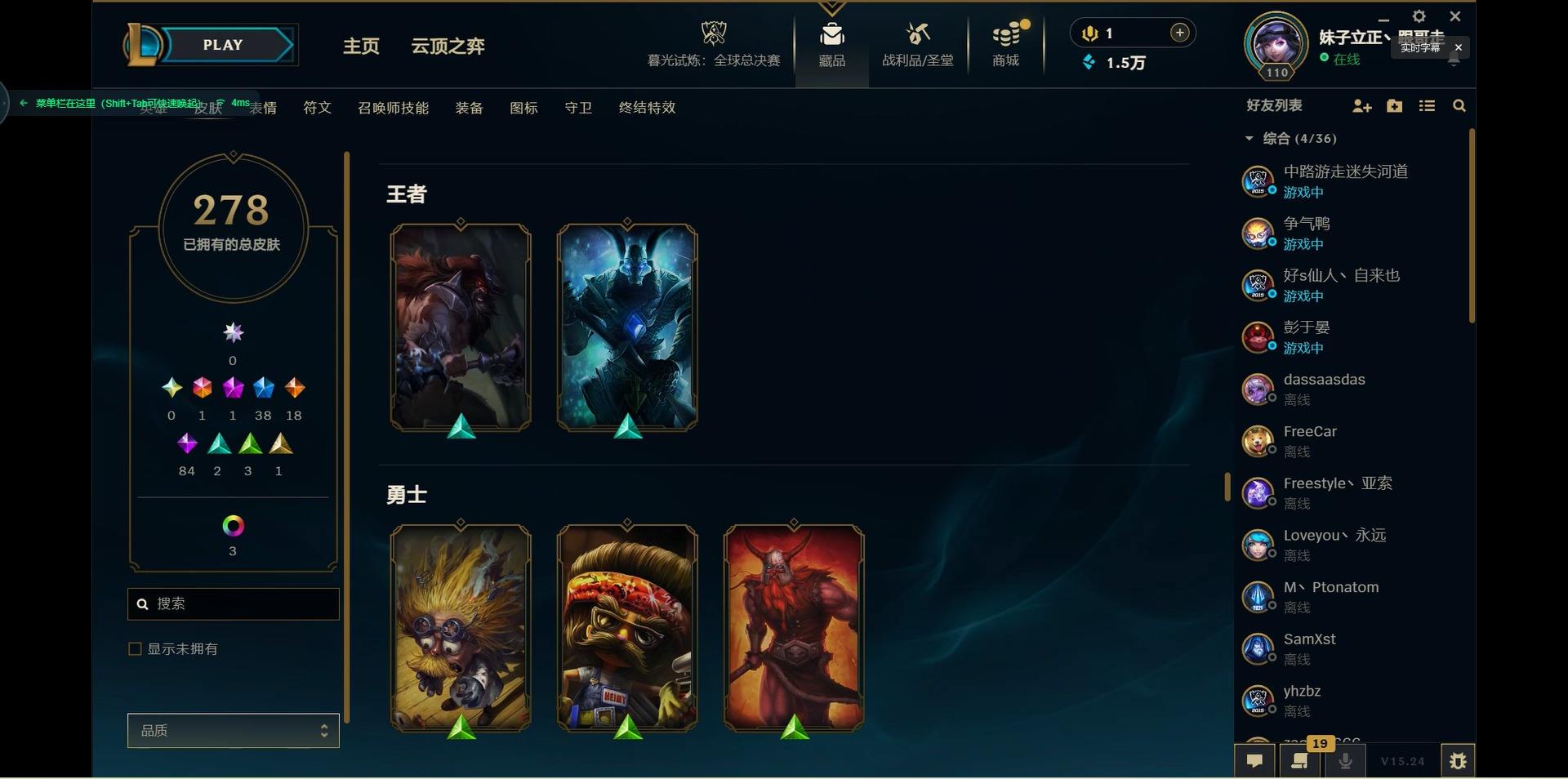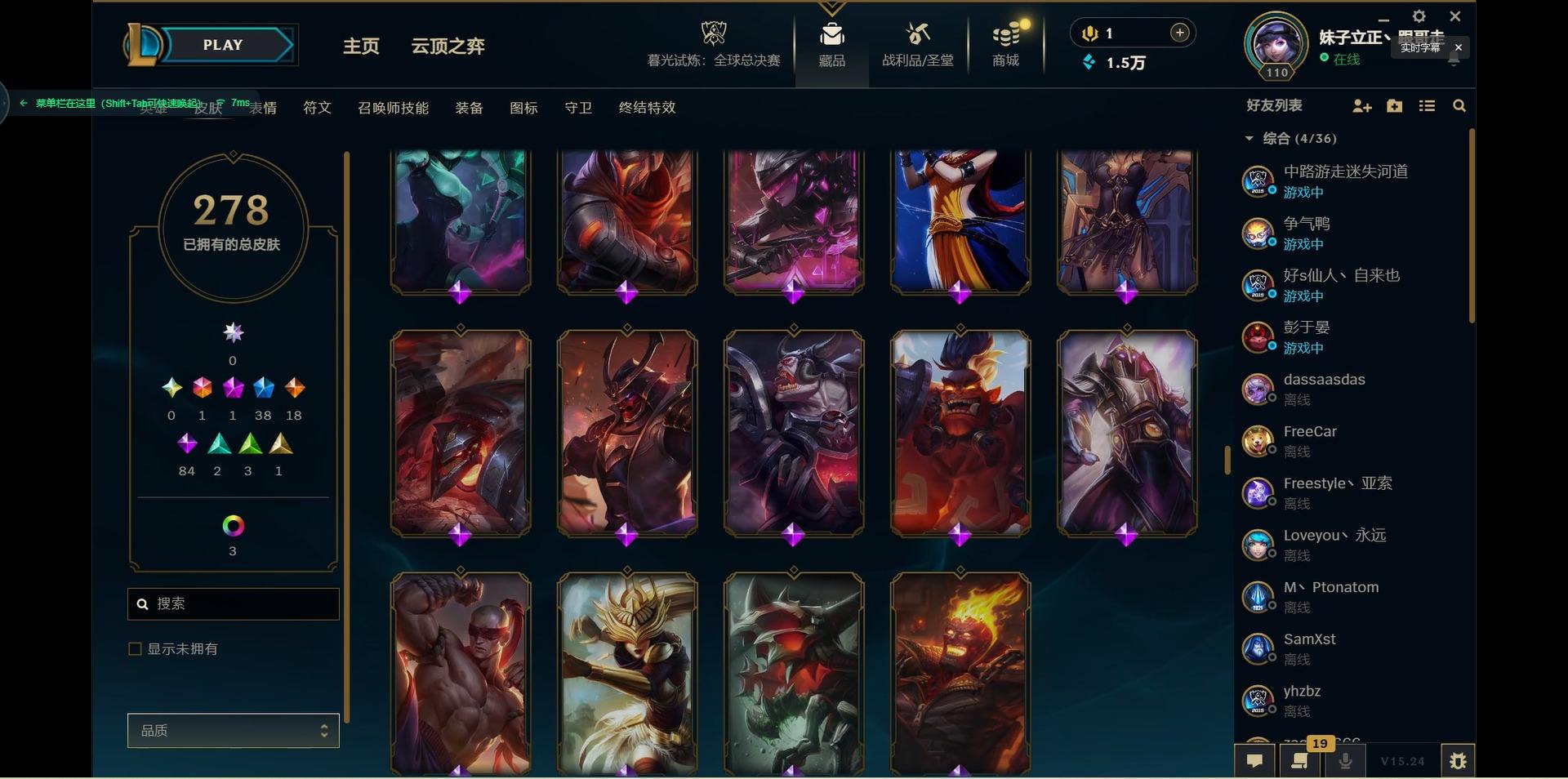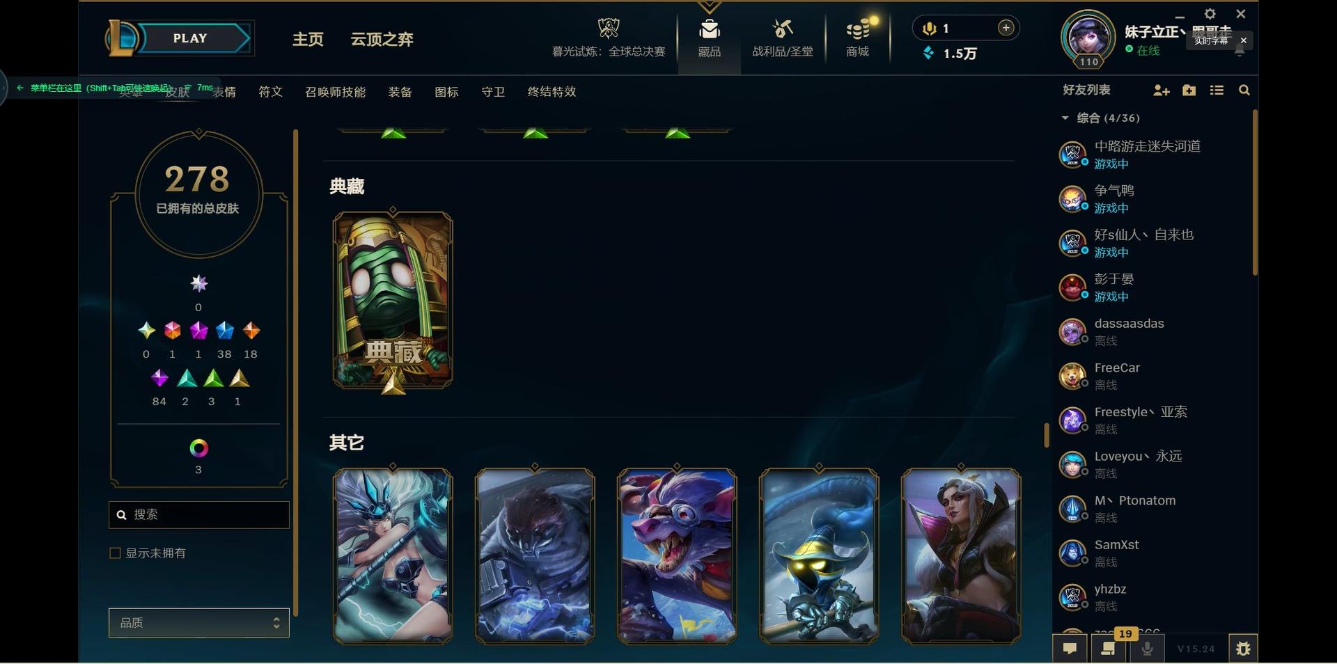 【299740】[15541077]1终极 1神话 38限定 18传说 84史诗 278皮肤 10炫彩 125英雄 可二次 可修改实名 【限定】:生化领主 泰达米尔【情人节限定】:觅心猎手 薇恩【冠军限定系列】:S2 暗杀星 蒙多,S2 暗杀星 努努,S2 暗杀星 慎,S4 SSW 泰隆【冰雪节限定】:阿木木:“主人不要我了”,冰雪女神 辛德拉,胡桃夹子 萨科,平安夜女神 娑娜,魄罗骑士 瑟庄妮