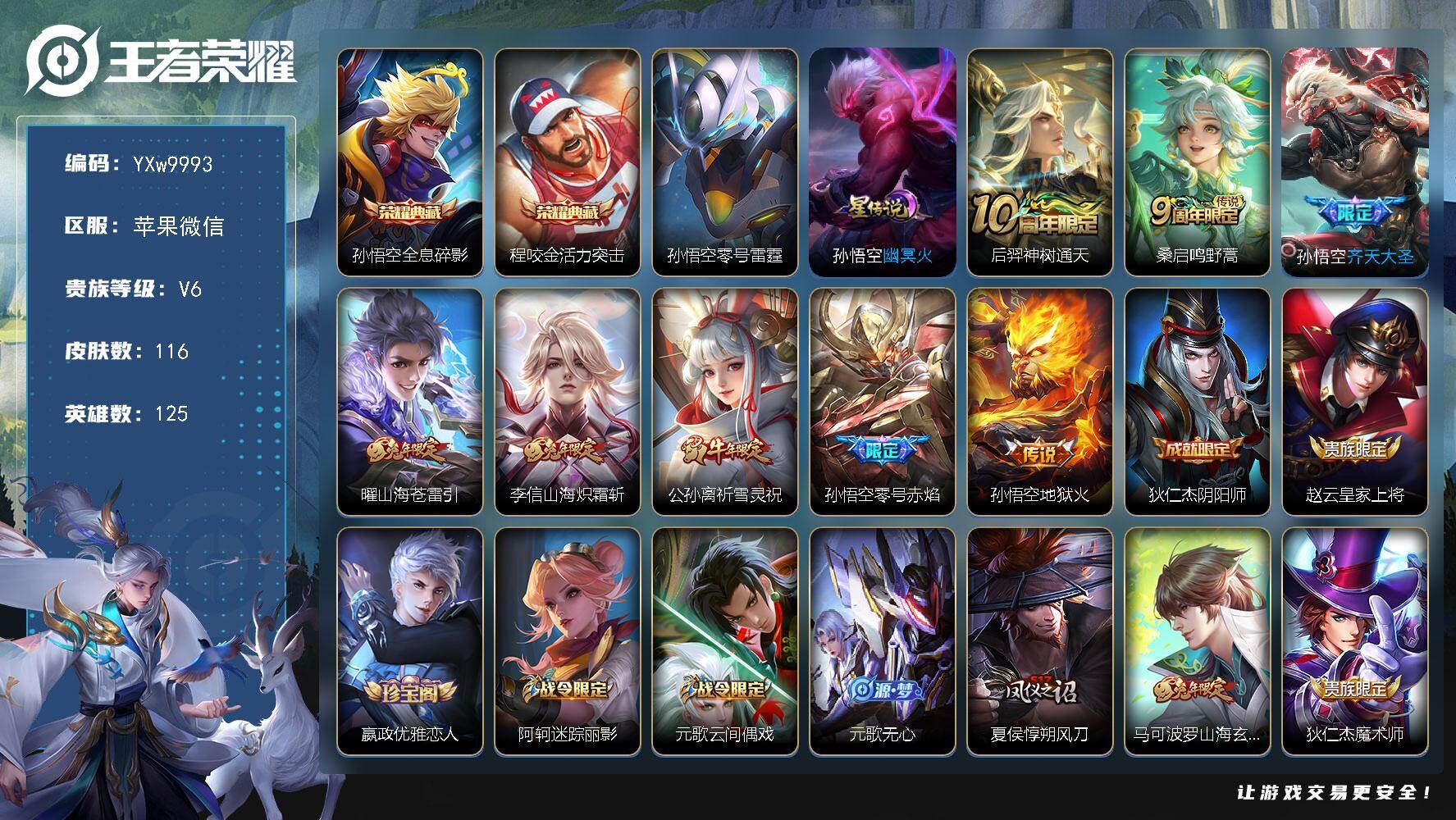 【300138】【可二次】【微信(苹果)】霸王丸 黎明之约 山海炽霜斩 夺宝奇兵 鹰眼统帅 偶像歌手 优雅恋人 哥特玫瑰 街头霸王 野性能量 命运角斗场 舞动绿茵 全息碎影 探海日志 死亡骑士 山海·苍雷引 龙腾万里 精灵王 冰刃幻境 灼热之刃 万事如意 万华元夜 零号雷霆 东海龙王 威尼斯狂欢 地狱火 汉昭烈帝 三太子 修罗 花好人间 疑决卦 醍醐杖 圆桌骑士 摇滚巨星 鬼剑武藏 阴阳师 齐天